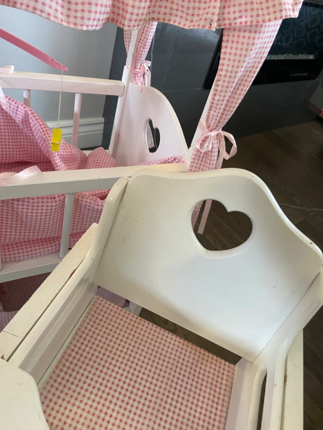 GUC Pink Gingham Wooden Doll Crib with Matching High Chair