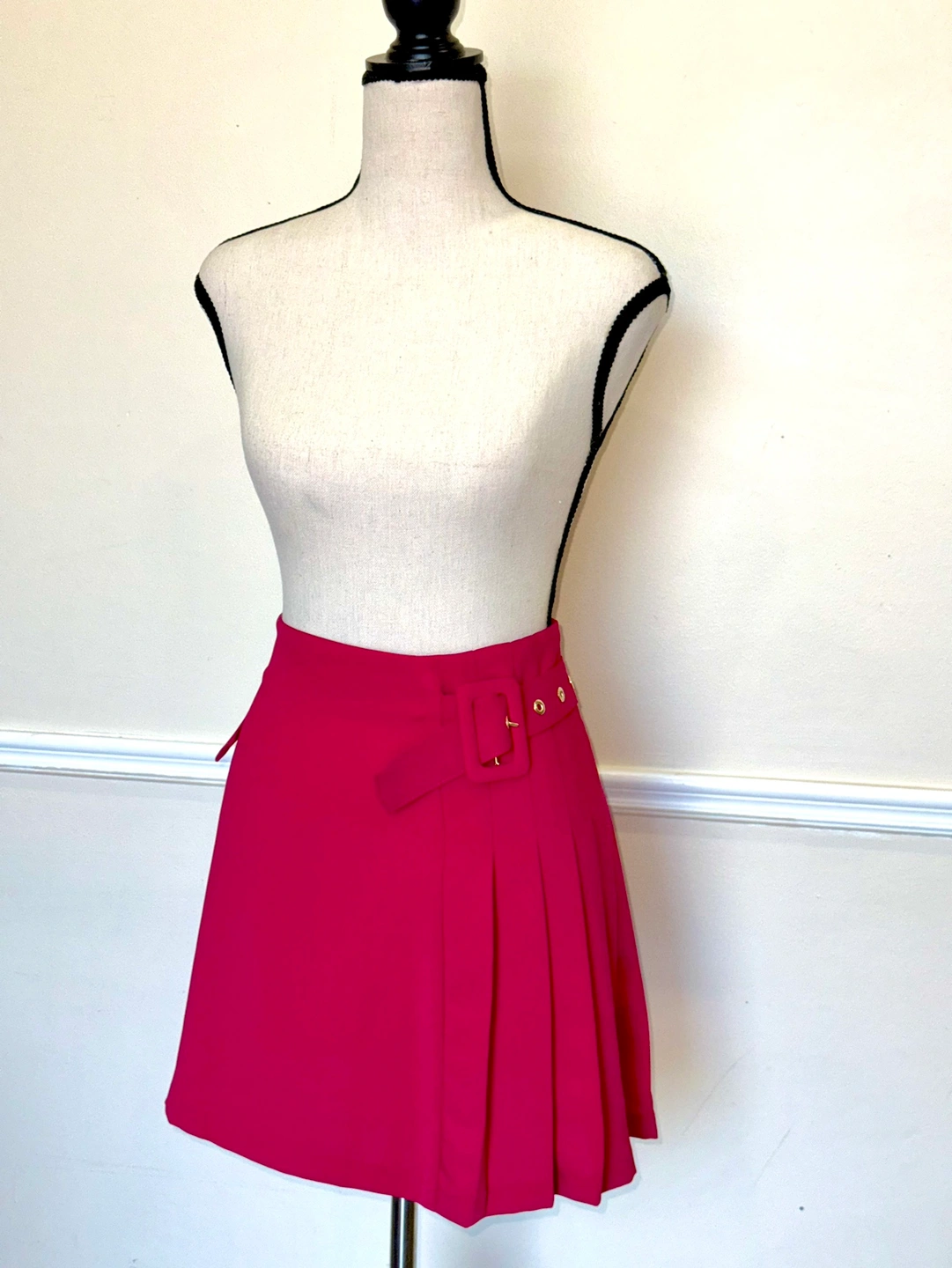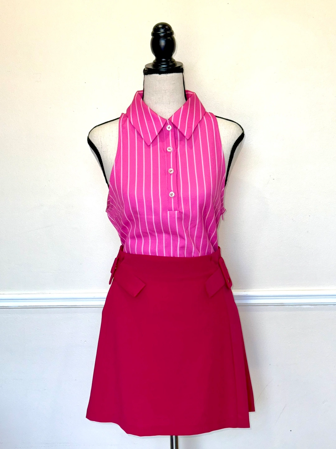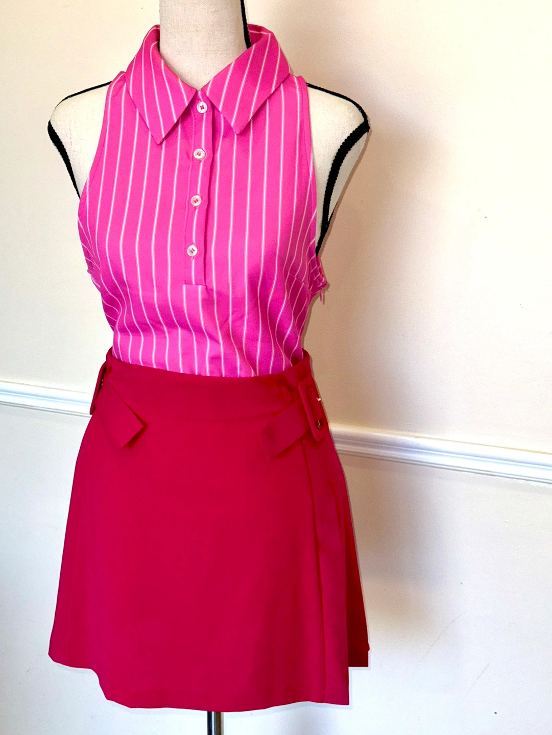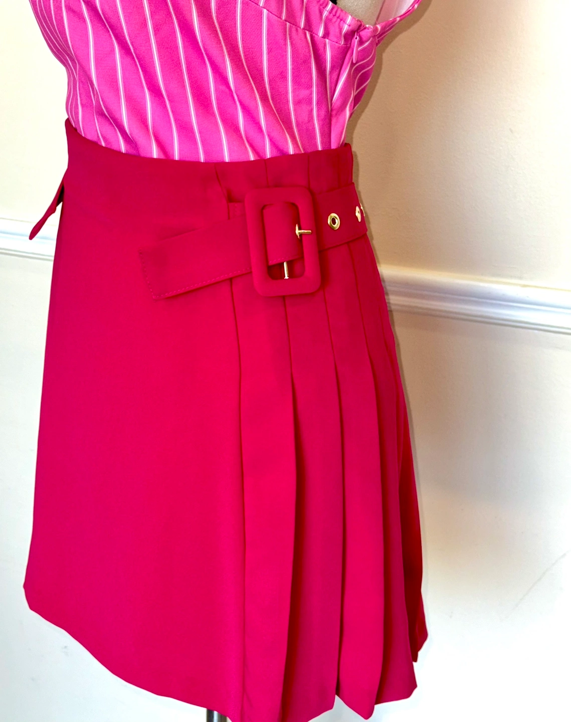 A cute pink pleated skirt with a matching belt & pink striped bodysuit.