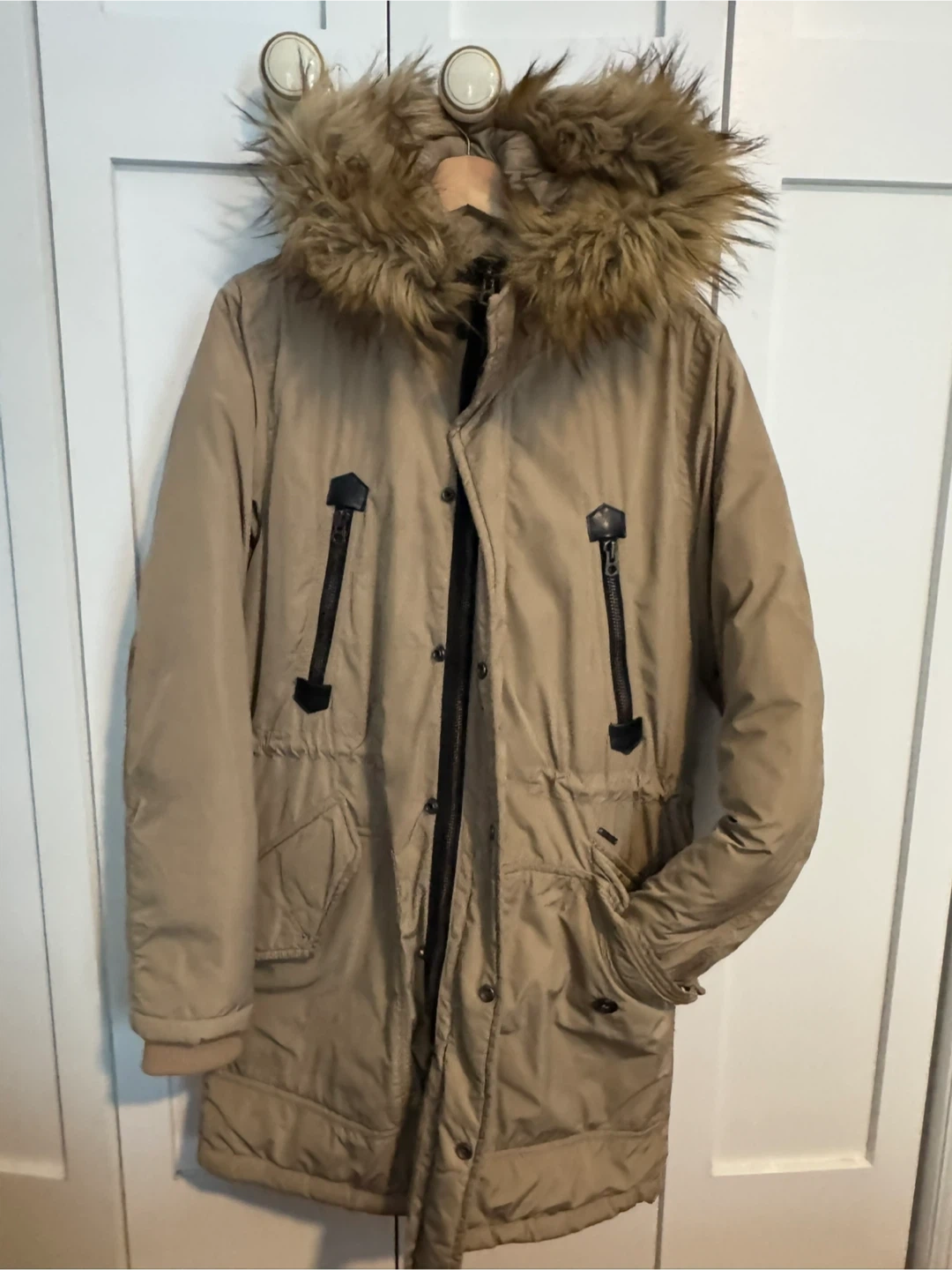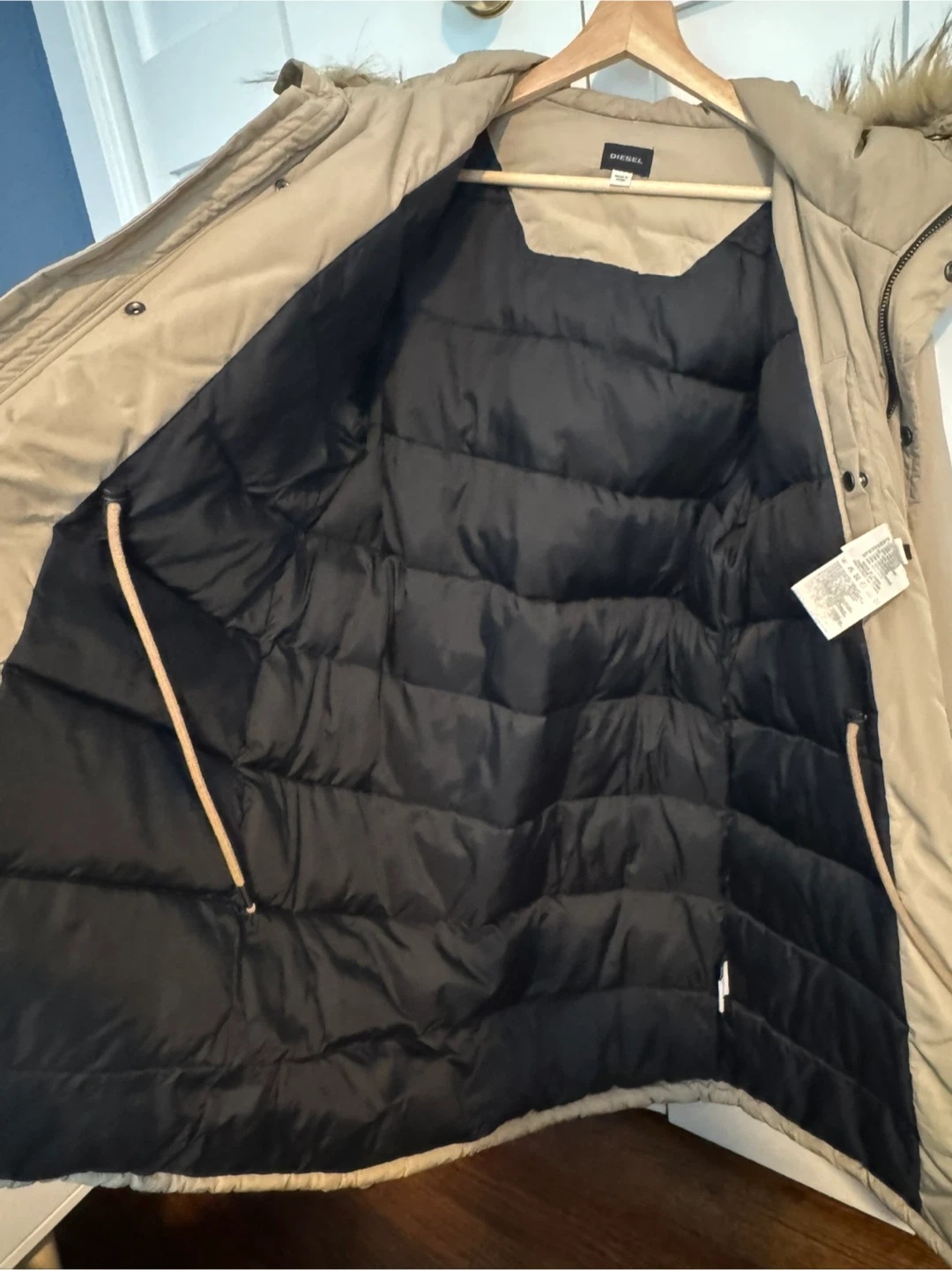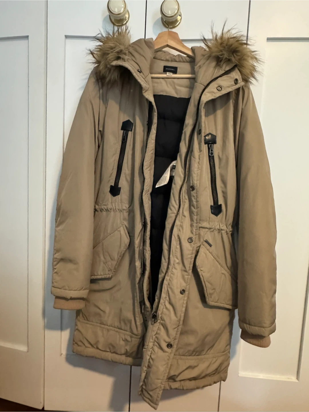 Diesel men's parka jacket in a tan color. It's a size medium and features a faux fur-lined hood. Made with 100% polyester. This jacket is perfect for staying warm during colder months! Very warm jacket, barely used, in like new condition