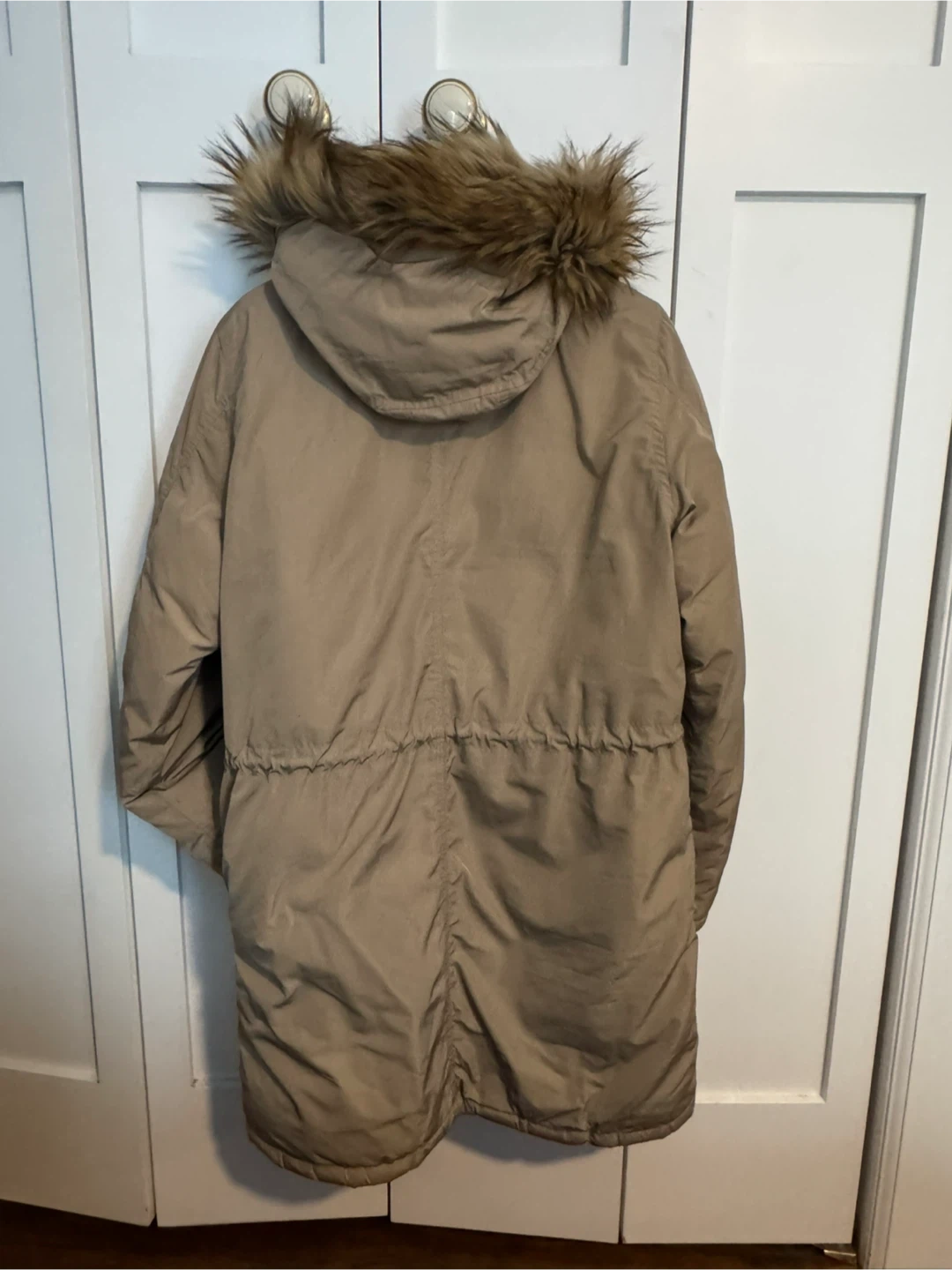 Diesel men's parka jacket in a tan color. It's a size medium and features a faux fur-lined hood. Made with 100% polyester. This jacket is perfect for staying warm during colder months! Very warm jacket, barely used, in like new condition