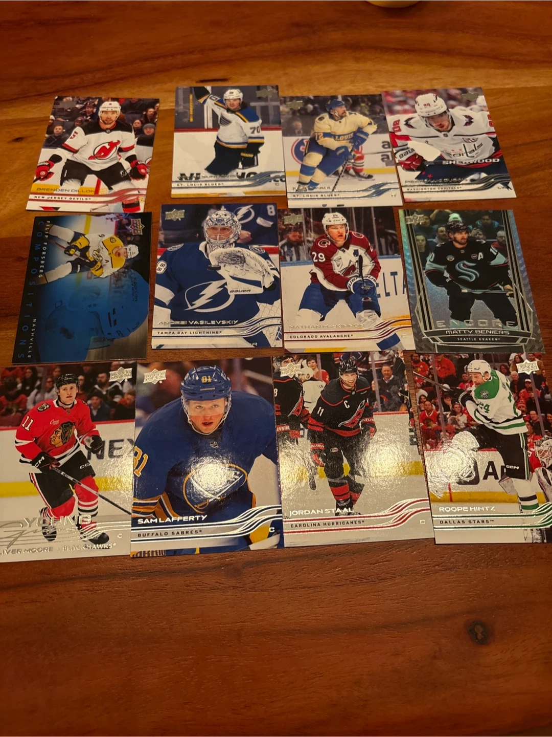 Collection of National Hockey League trading cards featuring various players and teams. Includes cards from Upper Deck and other brands. Great for any hockey fan!