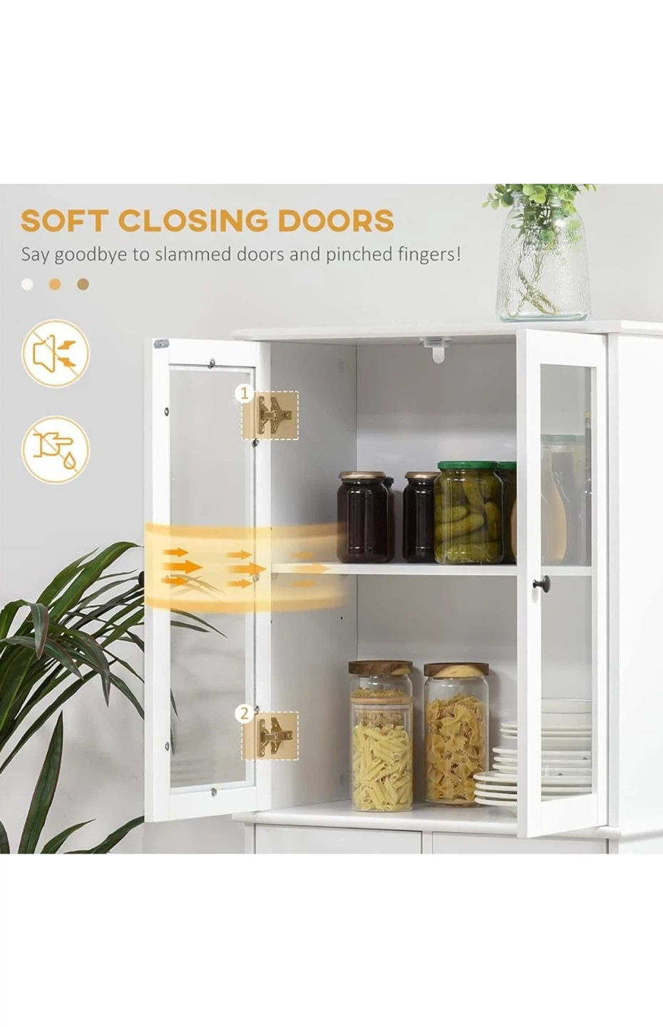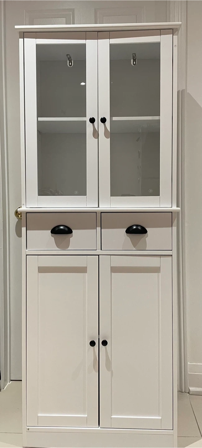 Versatile storage piece with a clean, modern look. The glass-door top is great for displaying dishes, décor, or books, while the shelves, drawers, and lower cabinet offer ample hidden storage.