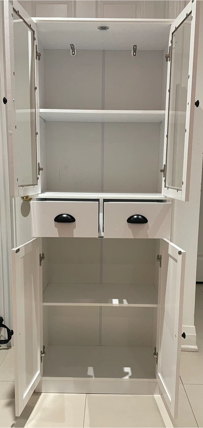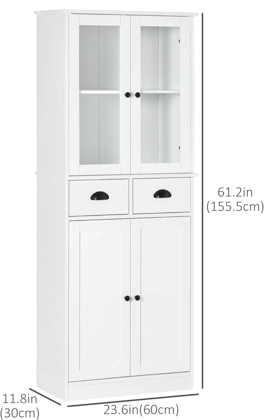 Versatile storage piece with a clean, modern look. The glass-door top is great for displaying dishes, décor, or books, while the shelves, drawers, and lower cabinet offer ample hidden storage.