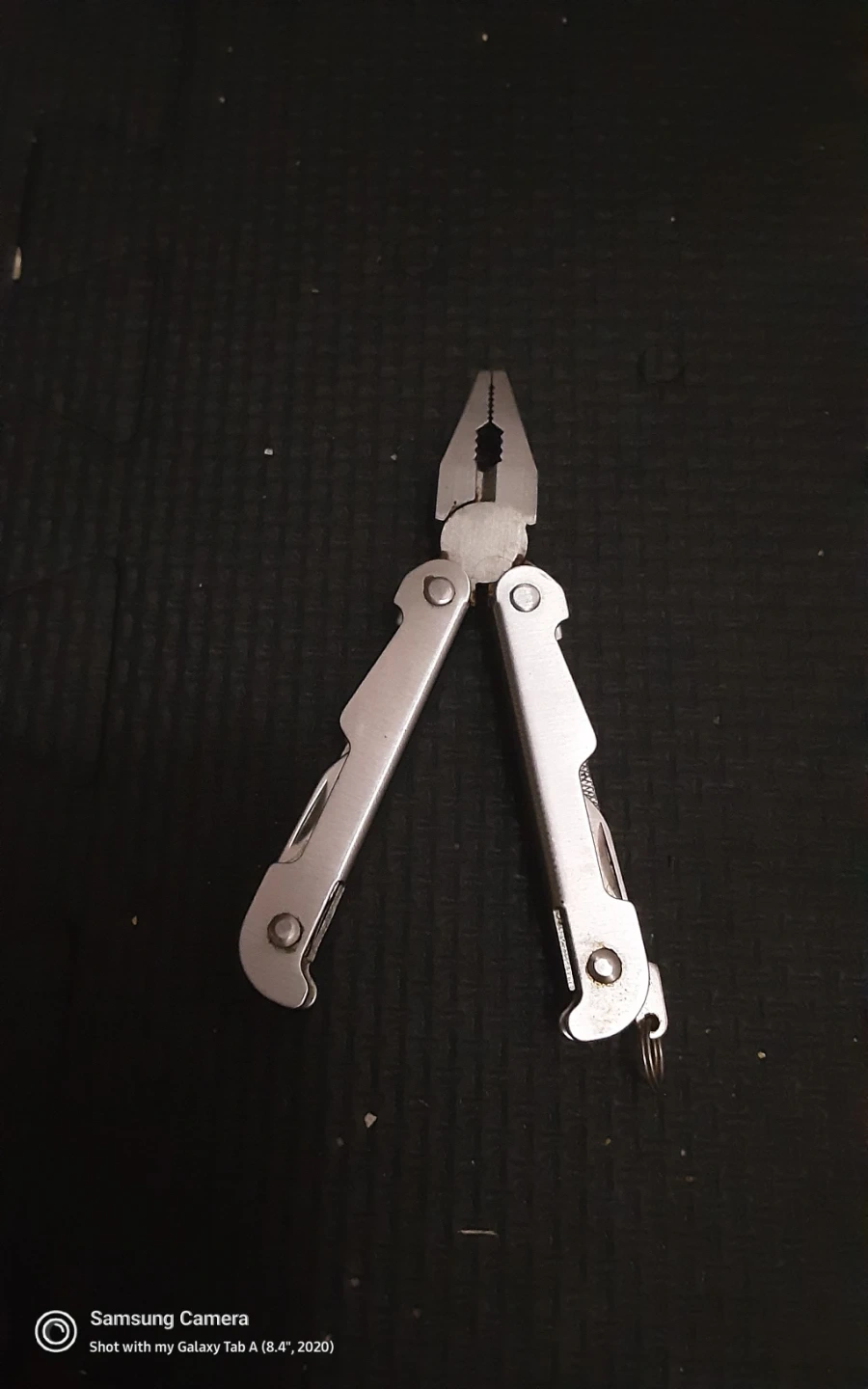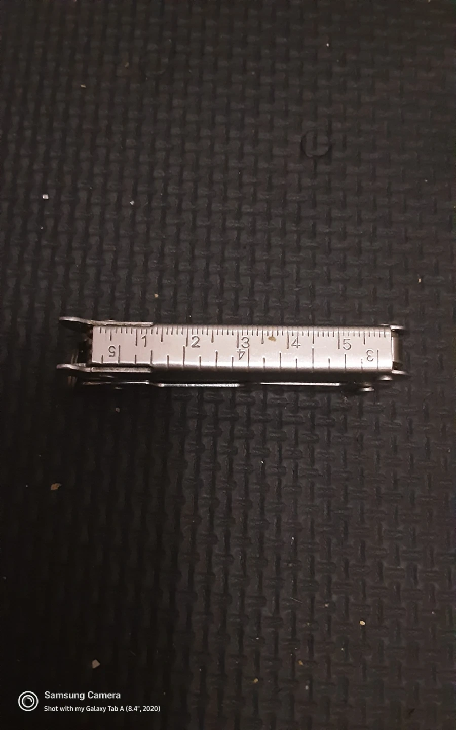 This is a compact multi-tool featuring pliers, a knife, and a ruler etched with imperial measurements up to 6 inches. It's made of stainless steel and includes a keyring attachment for easy portability. Handy for quick fixes and everyday tasks!