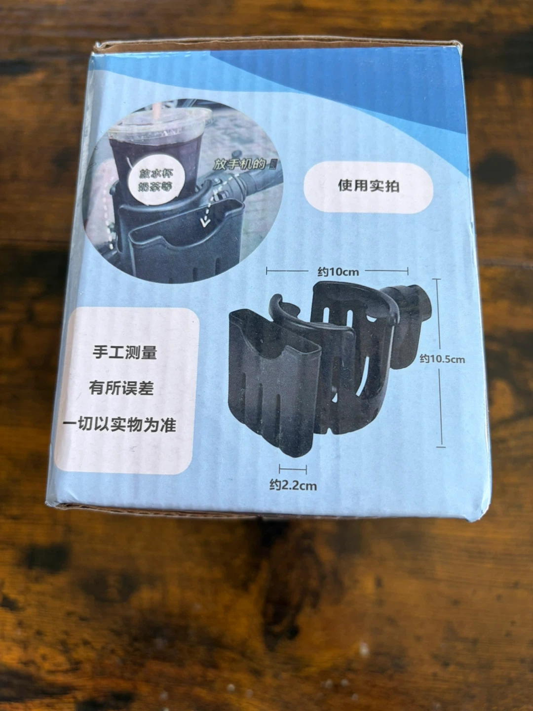This is an upgraded water cup holder designed for bicycles or strollers. It's made of durable ABS material. The holder measures 10cm x 2.2cm x 10.5cm, and the phone holder section is 9.5cm x 2cm x 9cm. It's suitable for placing water cups, milk tea, and other beverages. It can also hold phones with a width of approximately 2-4cm.
