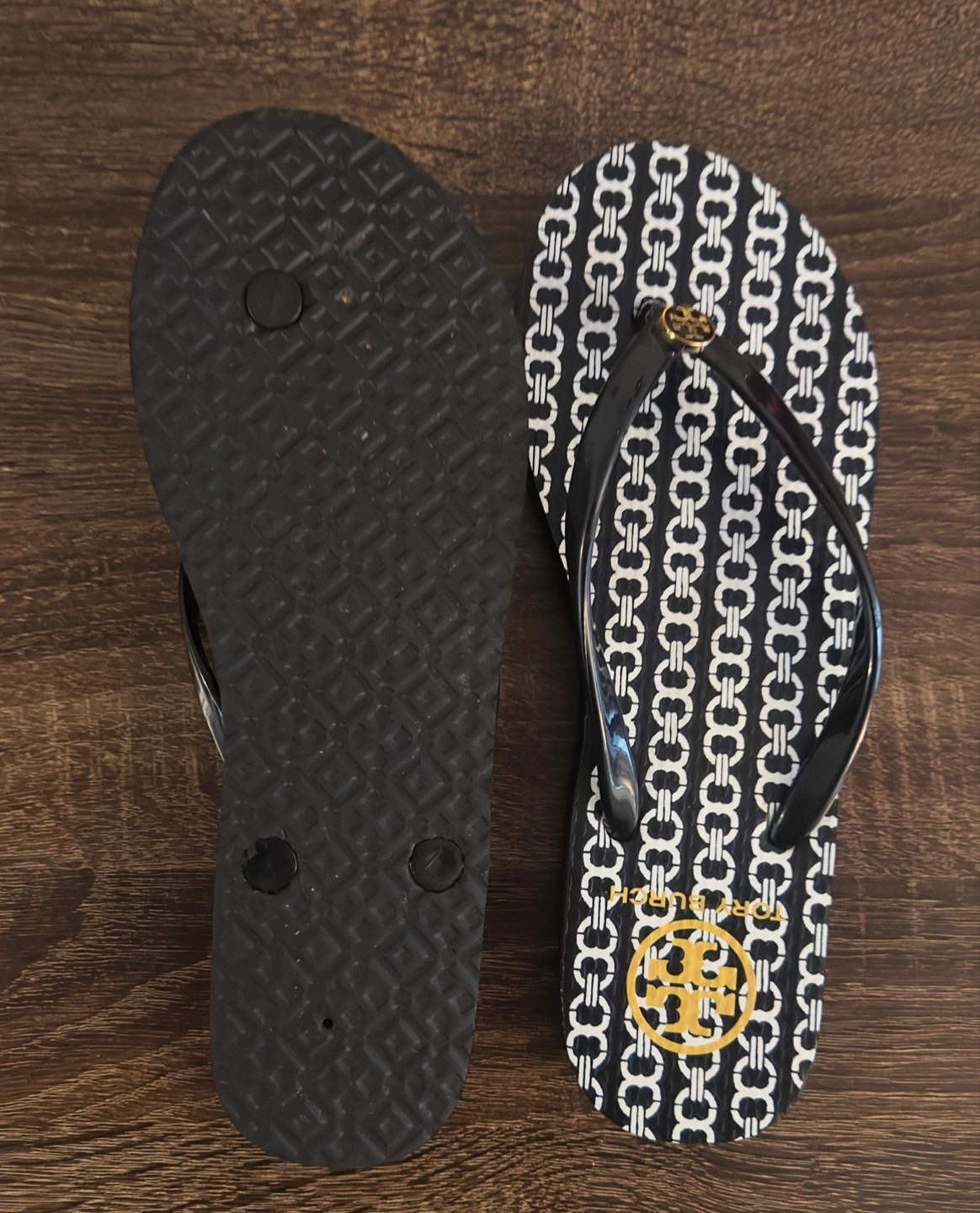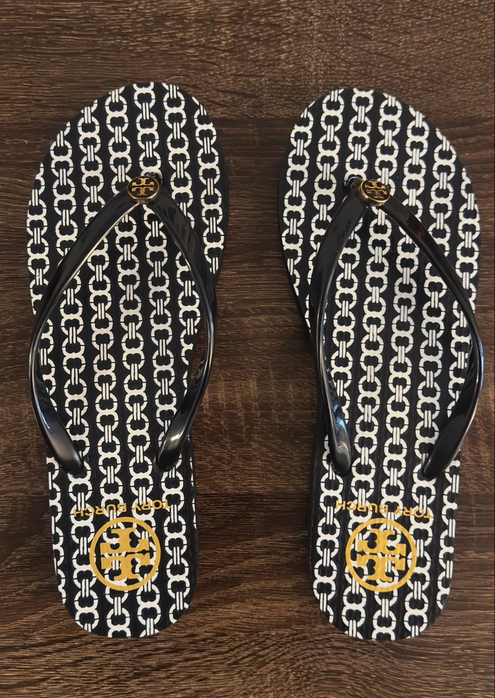 Pair of black and white flip flops. Chain pattern. Gold logo. Women's.