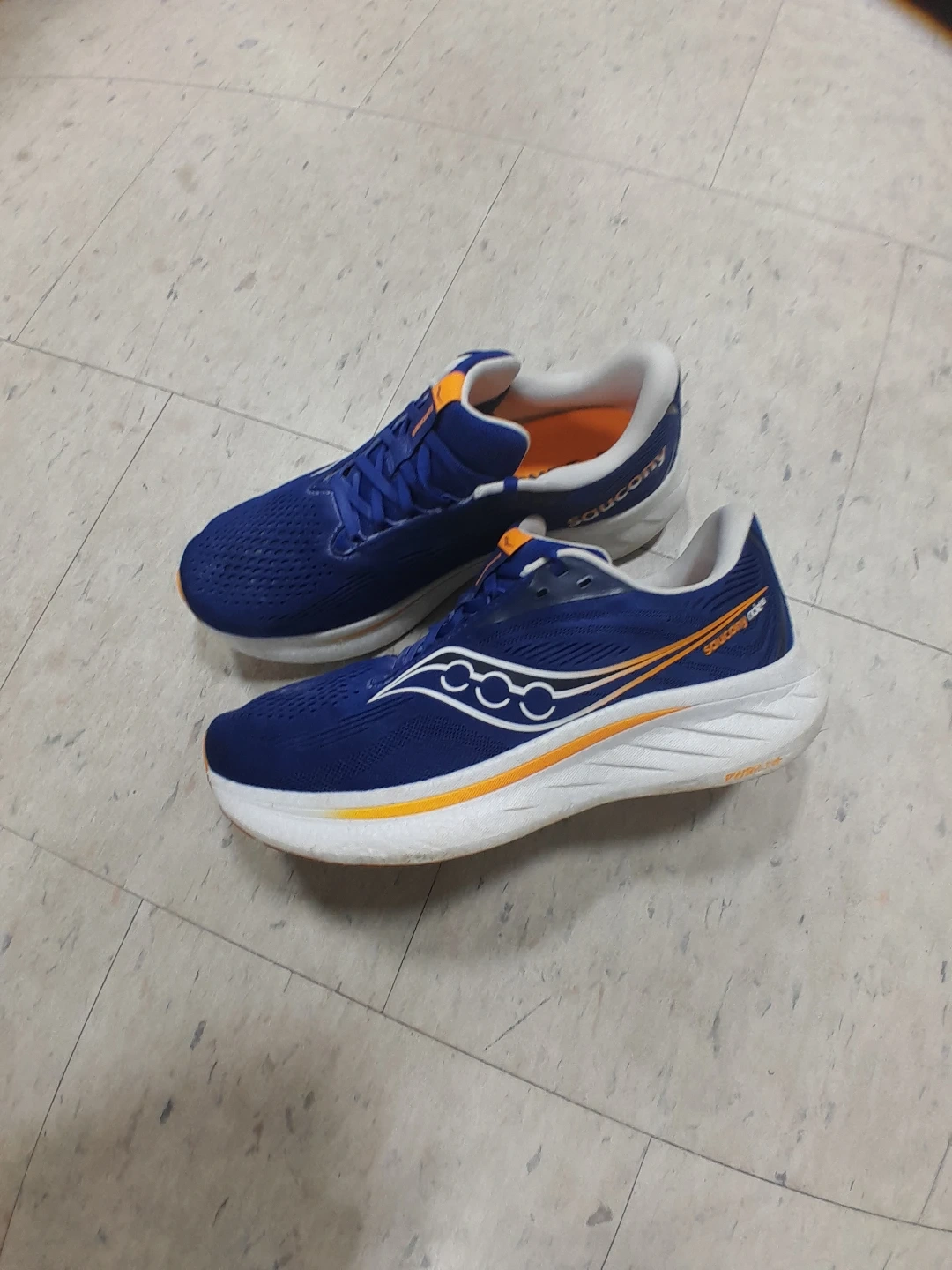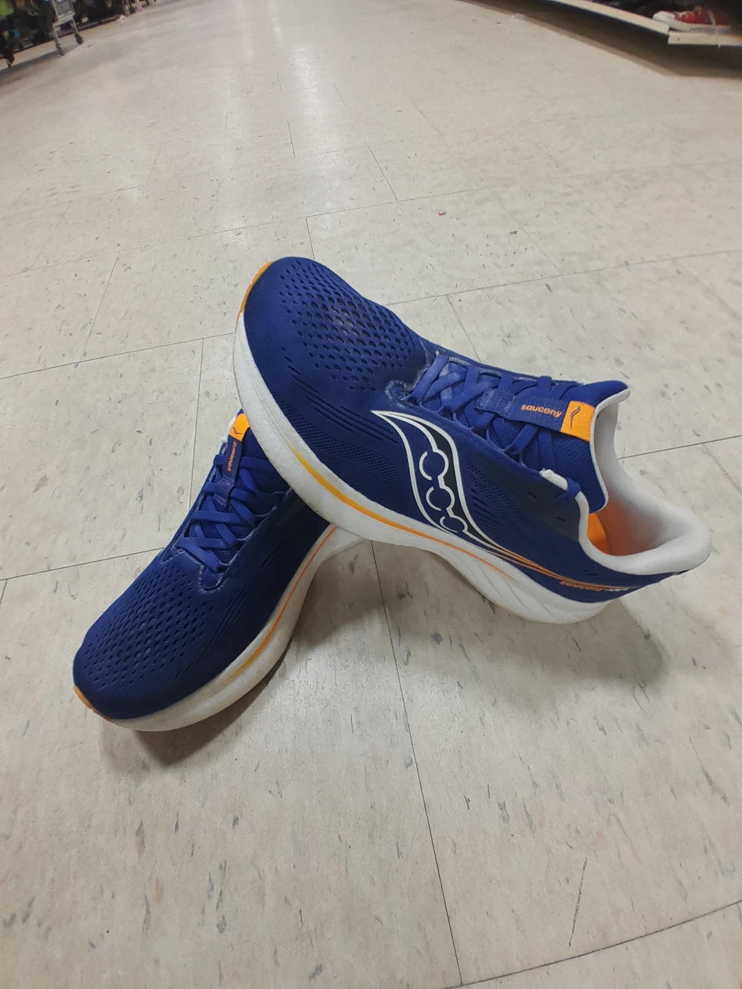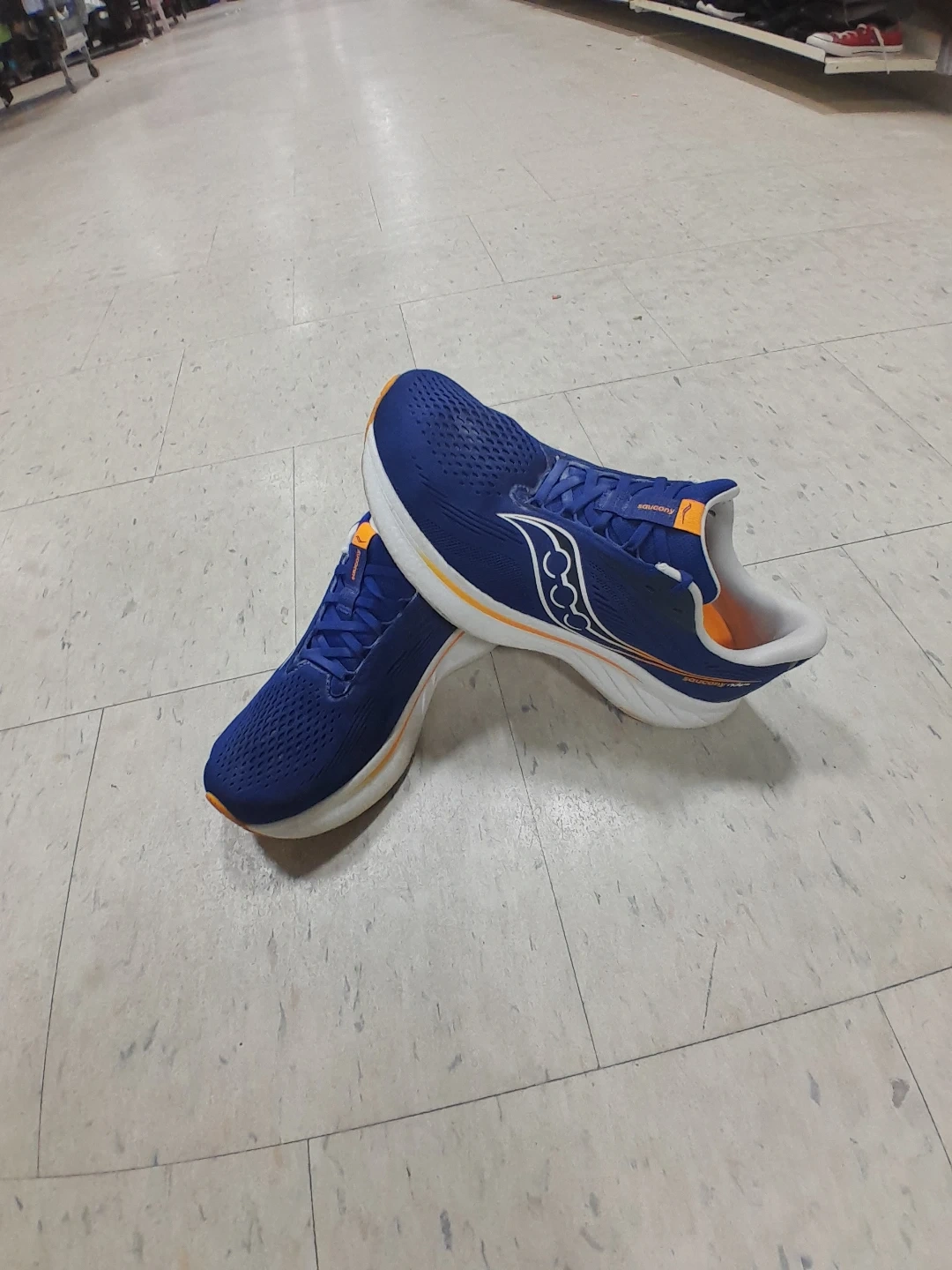Original Saucony running shoes blue They feature a mesh upper for breathability and a cushioned sole for comfort. The bright orange accents add a pop of colour. Great for your daily runs or gym workouts! Men's Size 9.5
