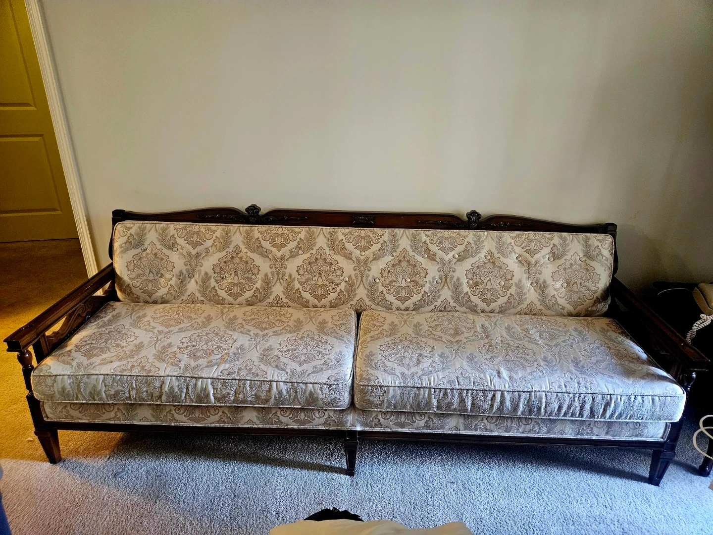 This is a vintage sofa with an ornate carved wood frame. It features a damask-style upholstered fabric. The sofa has a classic design with button tufting on the back cushions. It's a beautiful piece that would add elegance to any room!