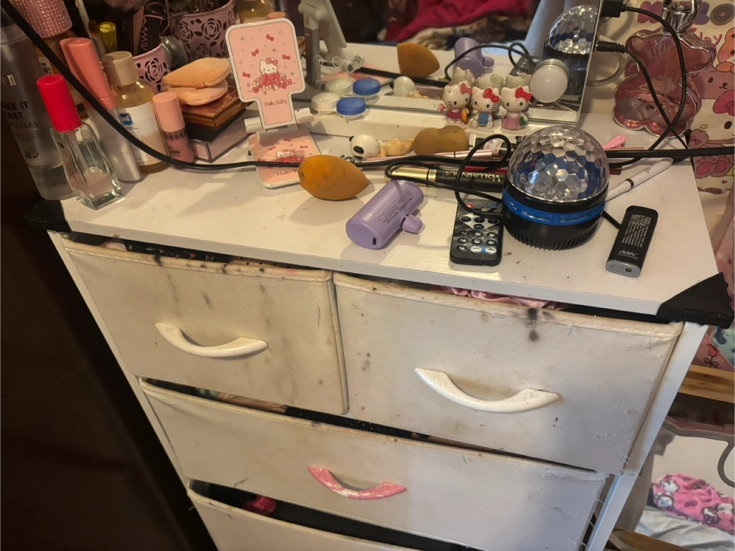 This fabric drawer dresser features six drawers for storage. It's white with different colored handles on some drawers. Some wear and tear are visible on the unit.