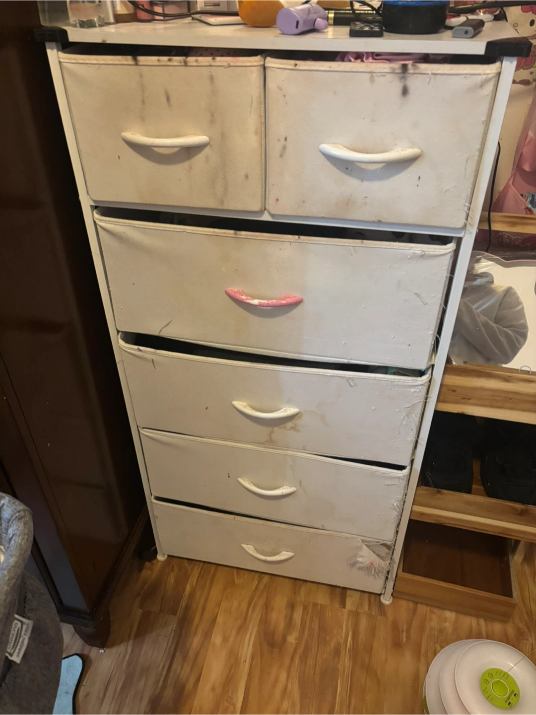 This fabric drawer dresser features six drawers for storage. It's white with different colored handles on some drawers. Some wear and tear are visible on the unit.