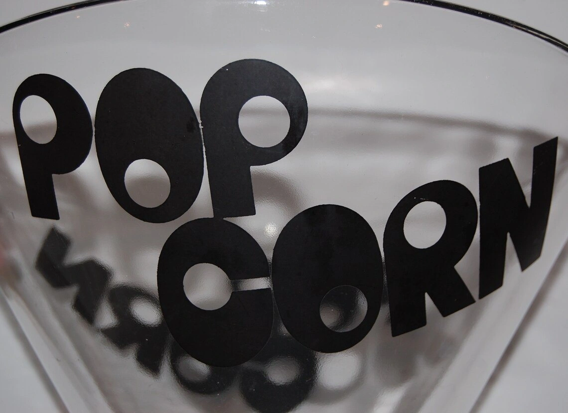 Lights, camera, action! Get ready for your retro movie nights with our vintage glass "POPCORN" bowl, perfect for all your popcorn needs. This large heavy glass bowl features the word "popcorn" in a groovy black font, adding to the retro vibe. The bowl is in perfect condition with little wear to the painted letters and no chips or cracks to the glass.
