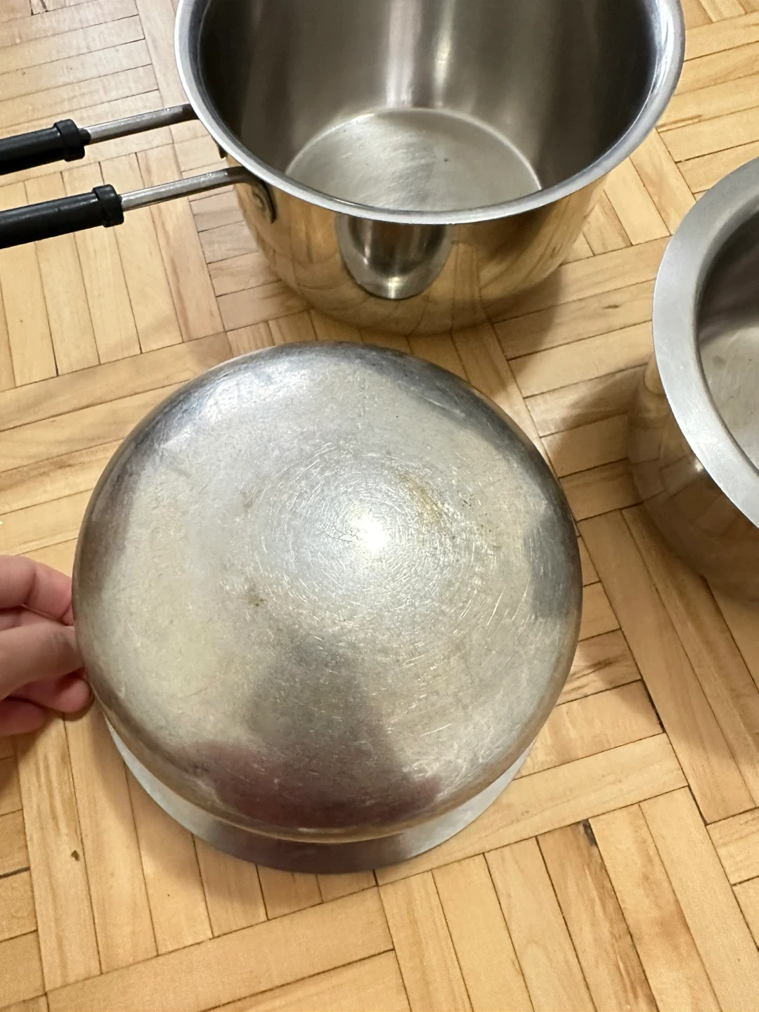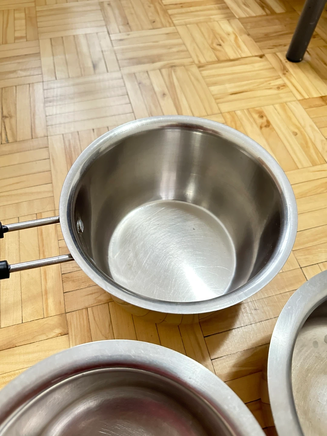 A set of three stainless steel cooking pots. One pot features a long handle with a black grip. These are durable and easy to clean pots. They're great for everyday cooking needs!