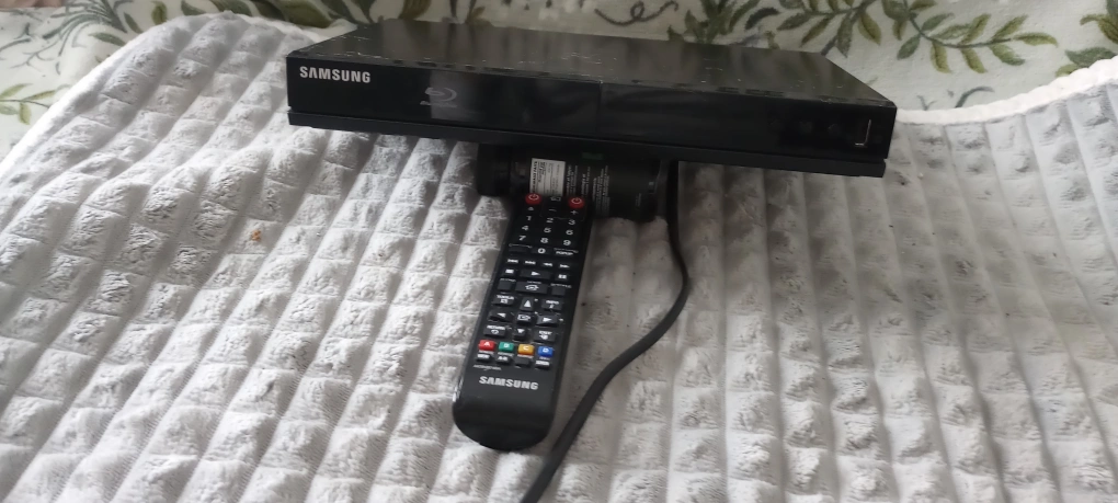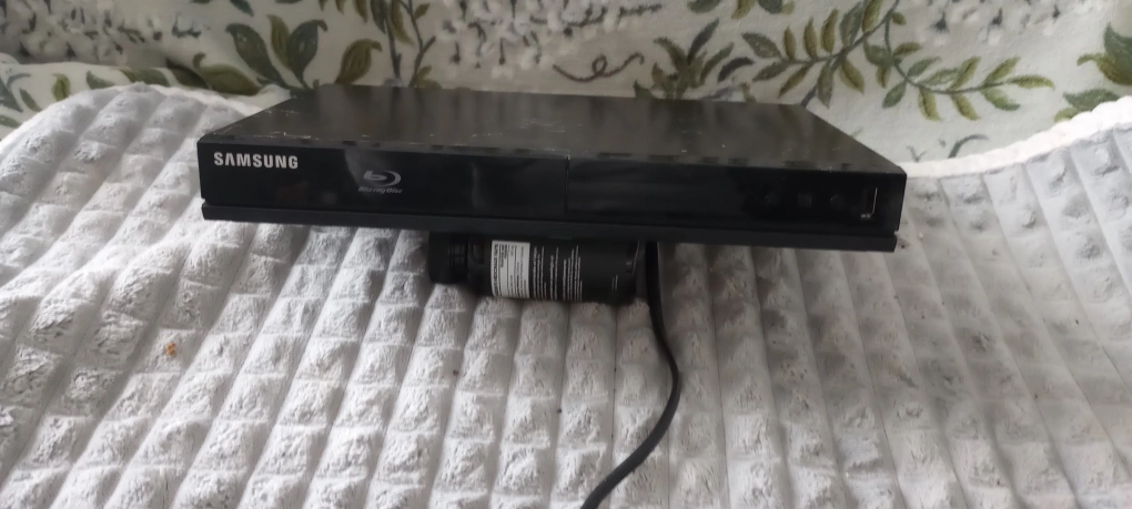 Pre-owned Samsung Blu-ray player. Includes remote control. Compact design. Plays Blu-ray discs. Good condition. from non smoking house