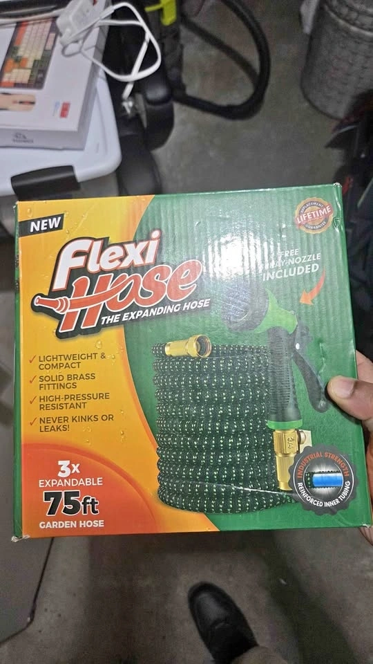 New Flexi Hose, still in the box! This is a 75ft expanding garden hose. Super lightweight and compact, has solid brass fittings, and is high-pressure resistant. No worries about kinks or leaks with this one. Plus, it comes with a free spray nozzle!
