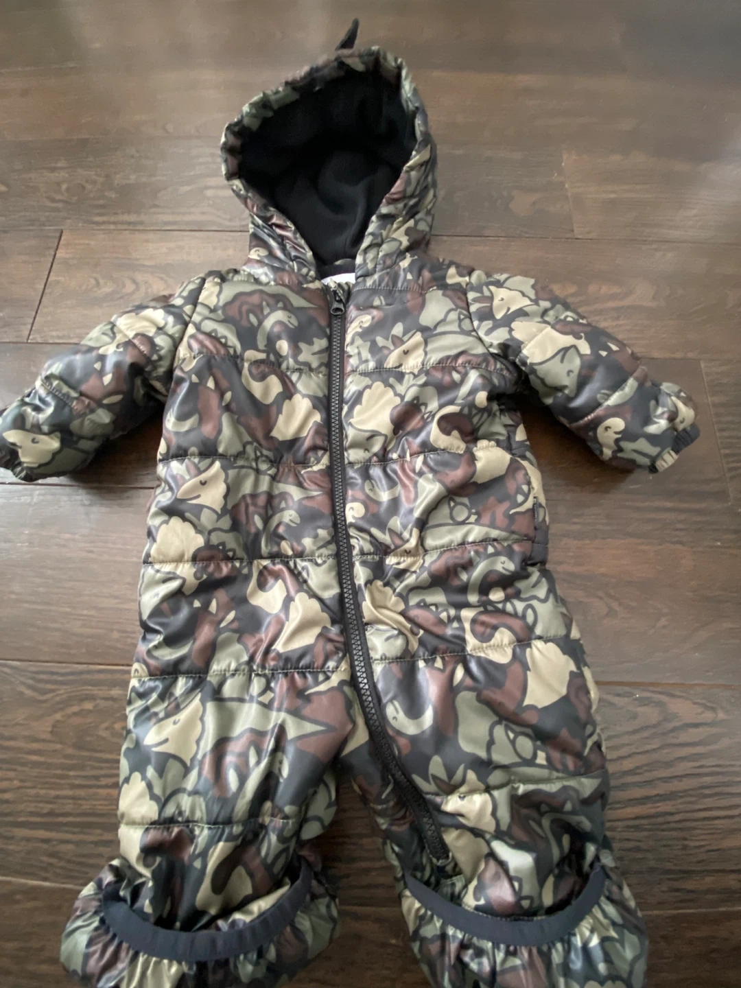 This kids' puffer snowsuit features a fun camouflage print with animal shapes. It's a full-zip design with a hood and elasticized cuffs. It looks like it's made for keeping little ones warm and dry.