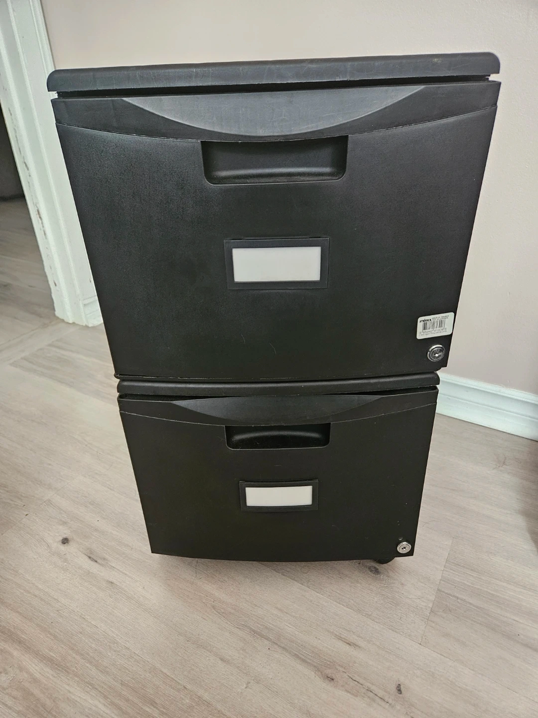 This is a black two-drawer filing cabinet. It's made of durable plastic. The drawers have labels for easy organization. Keys included