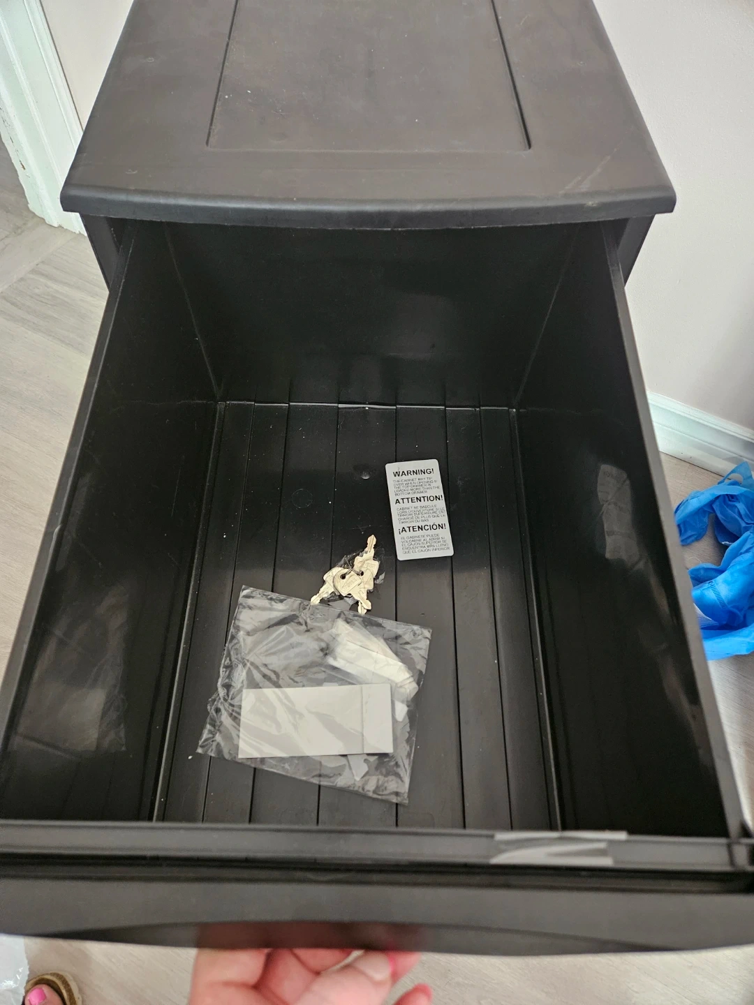 This is a black two-drawer filing cabinet. It's made of durable plastic. The drawers have labels for easy organization. Keys included