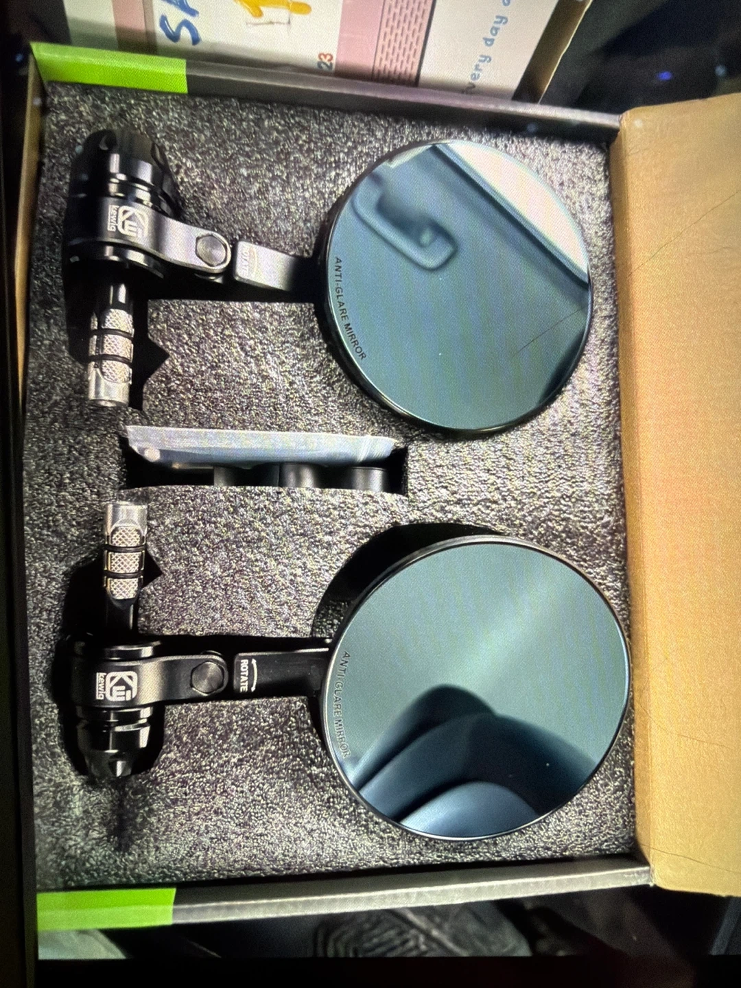 These are a pair of motorcycle handlebar bar end mirrors. They feature anti-glare wide angle convex lenses for better visibility. Included in original packaging.