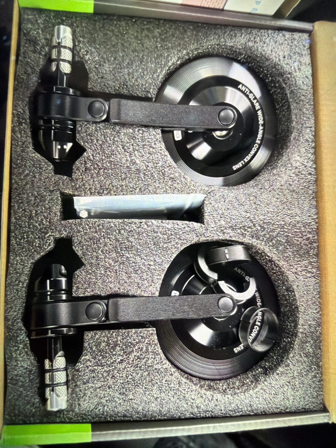 These are a pair of motorcycle handlebar bar end mirrors. They feature anti-glare wide angle convex lenses for better visibility. Included in original packaging.