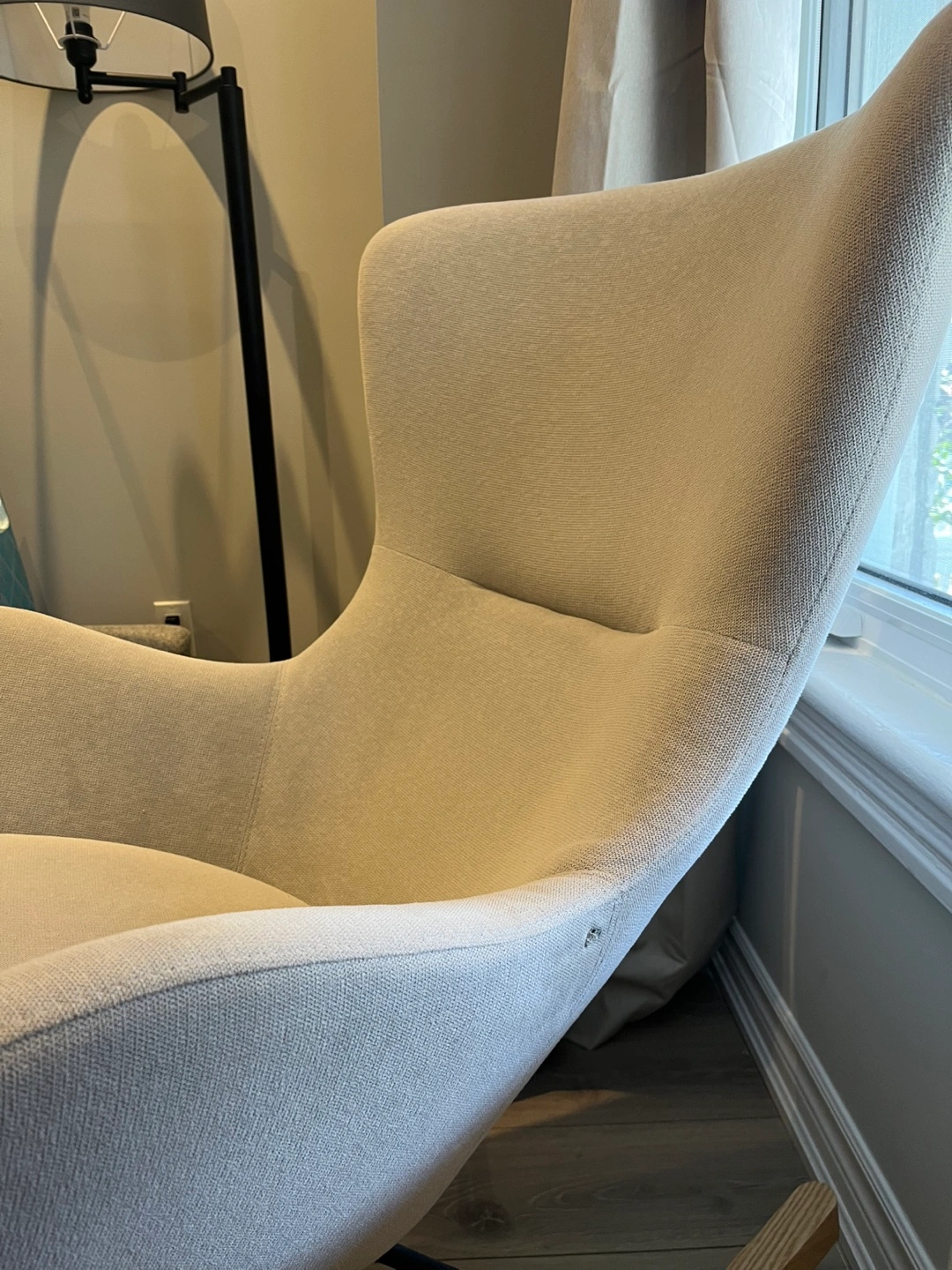 There is a small hole on side of the arm, see photos. Otherwise in great condition. Perfect for living room or baby nursery.