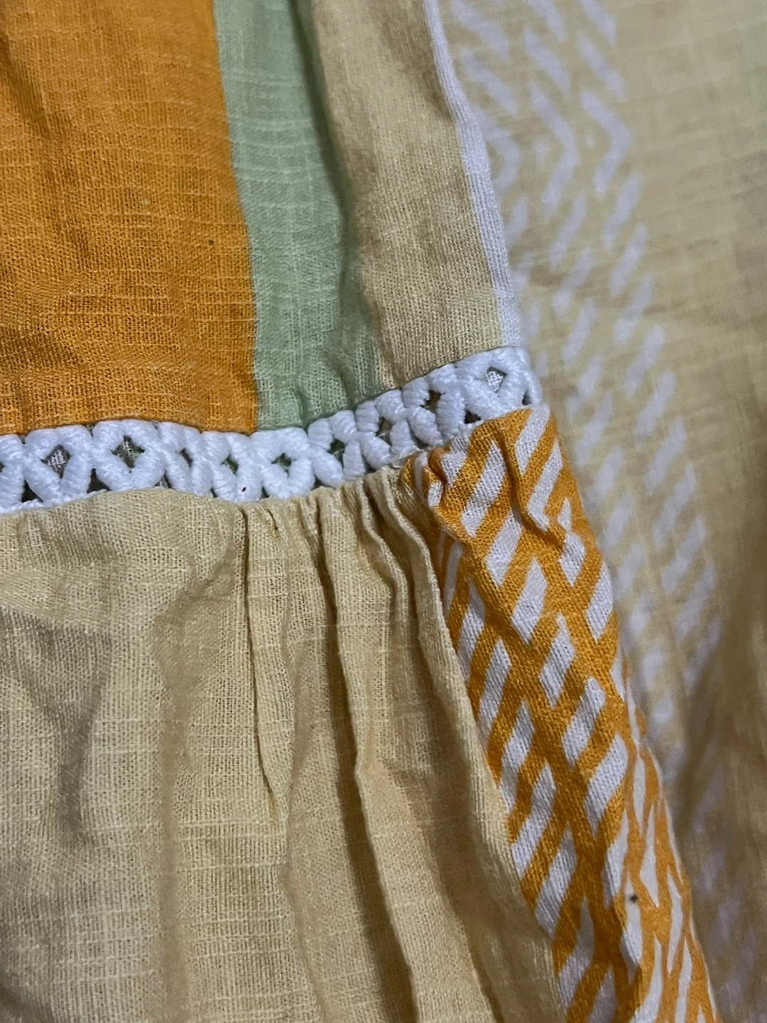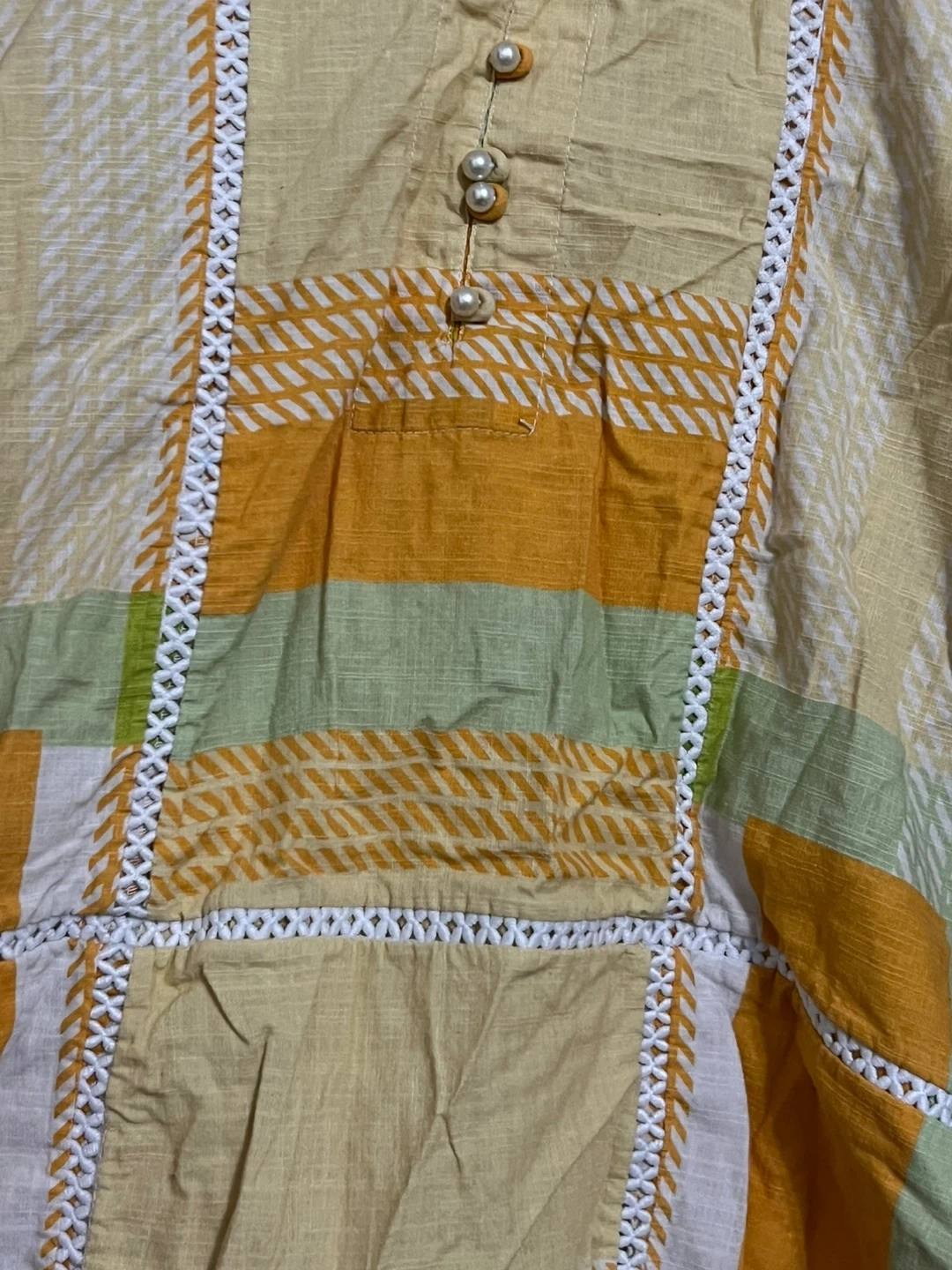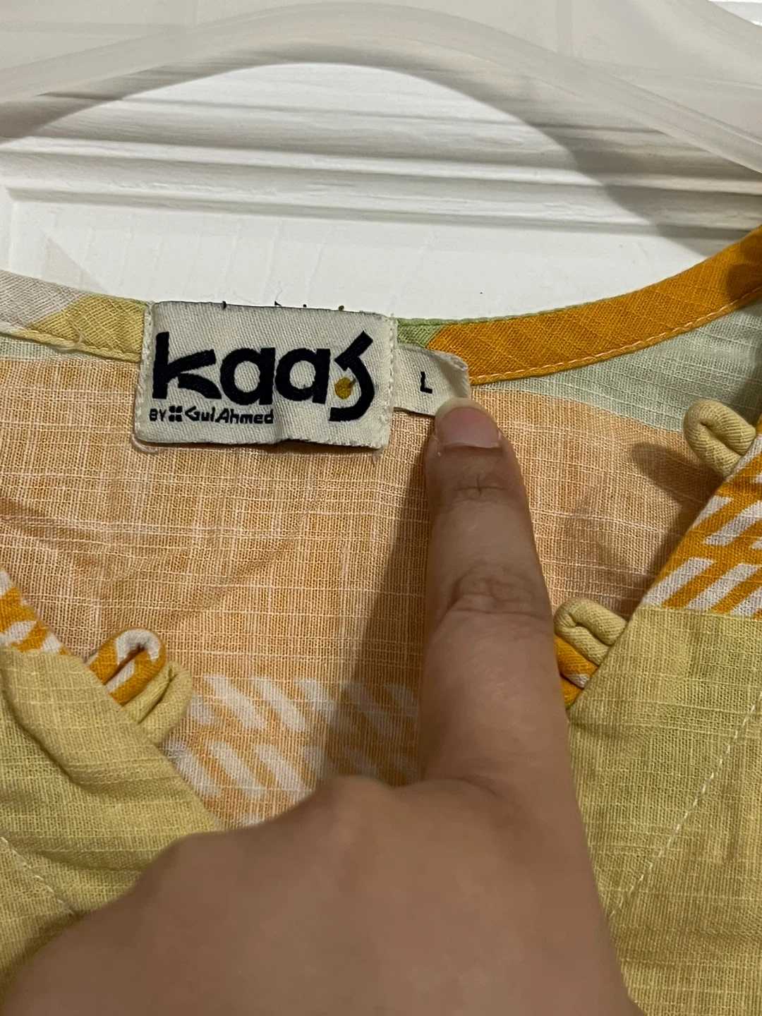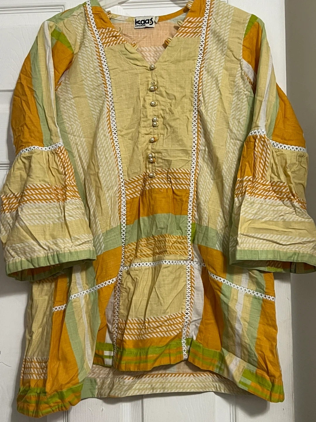 Selling a Kaas by Gul Ahmed tunic in size L. It features a unique pattern with orange, yellow, and green hues. The tunic has decorative white crochet detailing and pearl-like buttons. It's in great condition and ready for a new home!