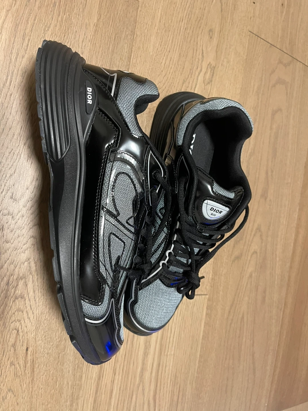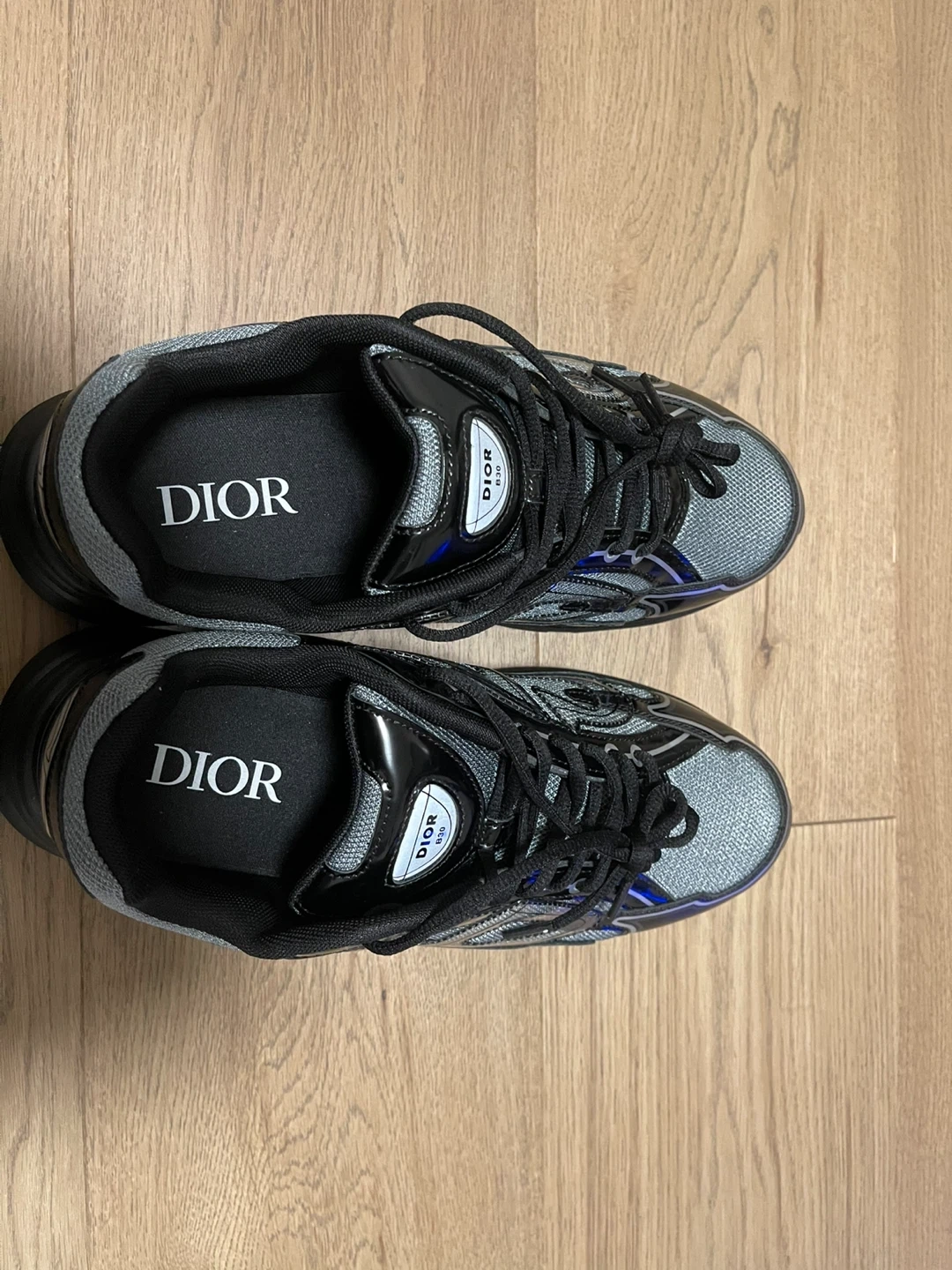 Dior B30 sneakers in black and grey. Features a CD logo on the heel tab and a lace-up closure. Made with leather and technical fabric. Size 46 fits 45-44