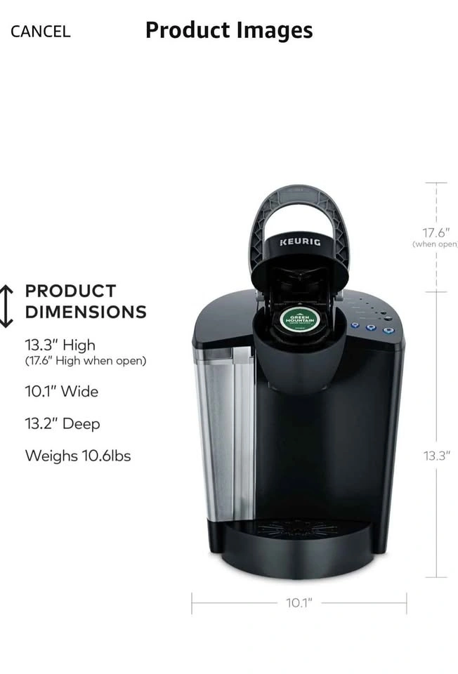 Programmable Keurig K-Classic coffee maker. Single serve K-Cup pod brewer. Has 6 to 10 oz brew sizes. Removable drip tray fits travel mugs. Has a 48 oz removable water reservoir. Dimensions are 13.3" high (17.6" when open), 10.1" wide, 13.2" deep. Used only once but needed more counter space. Includes filter holder. Pick up in Niagara Falls.