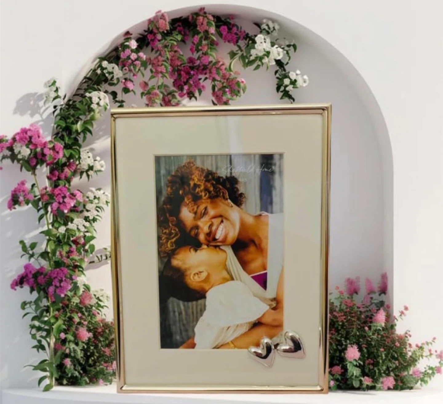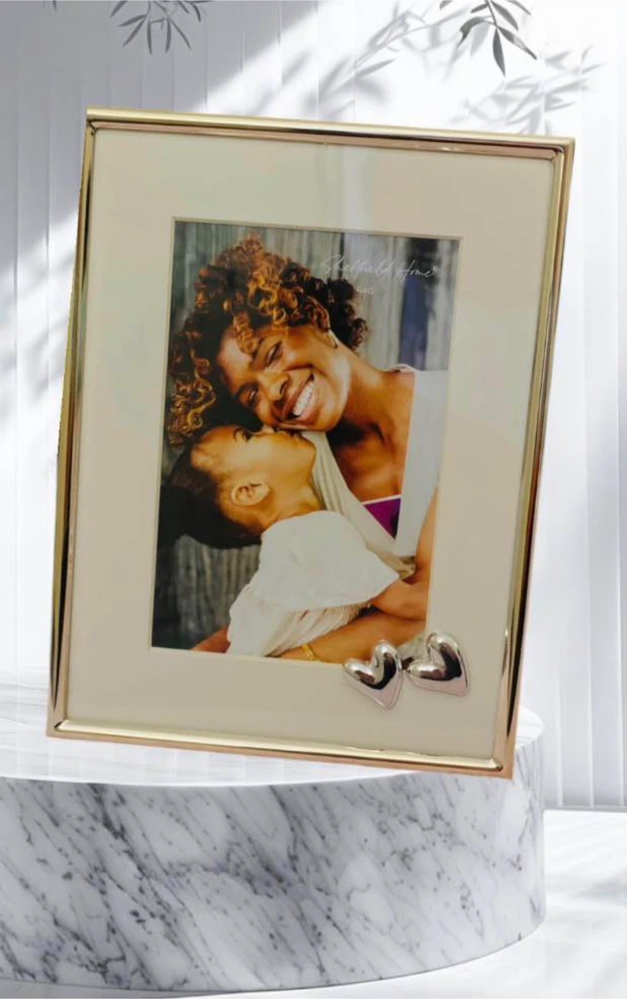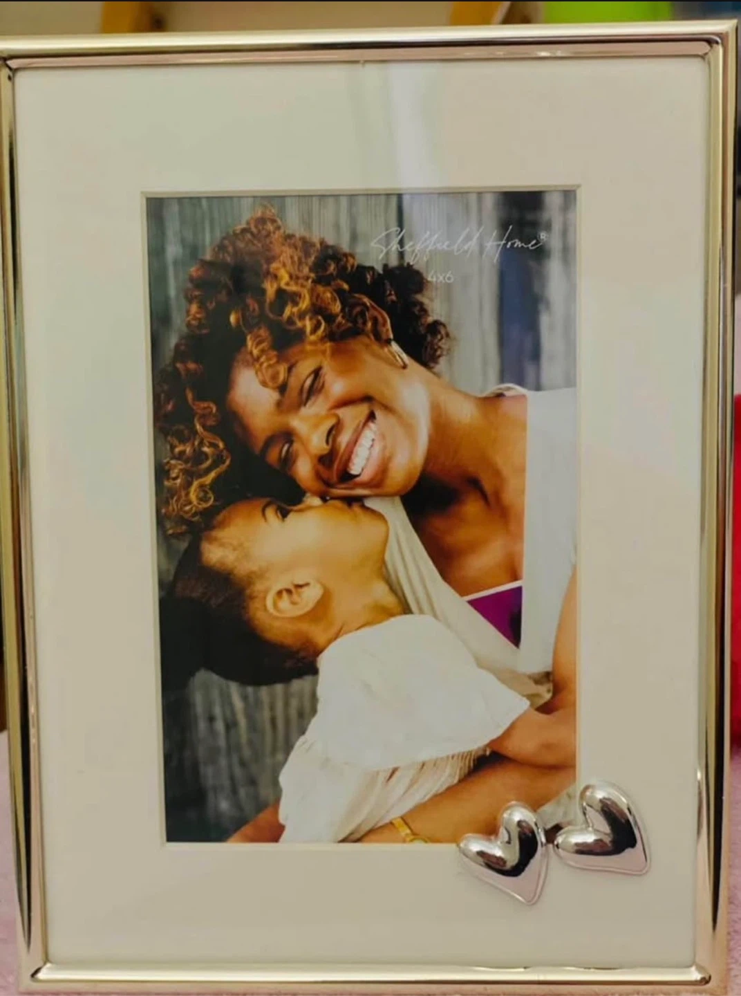 Selling a Sheffield Home picture frame that holds a 4x6 photo. It features a gold-tone frame and two silver hearts at the bottom. Perfect for displaying your favorite memories!