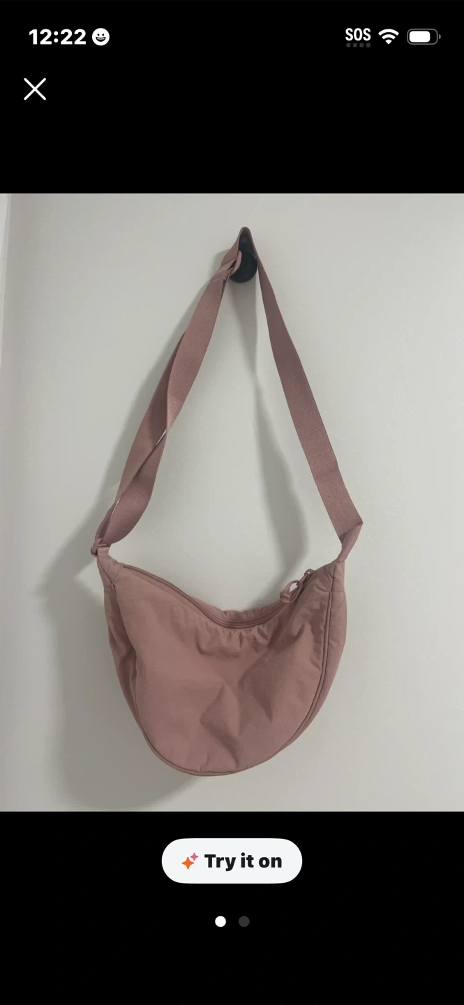 A dusty rose coloured shoulder bag with a crescent shape. It has a zipper closure and an adjustable strap. This bag is great for everyday use! Pick up cash only