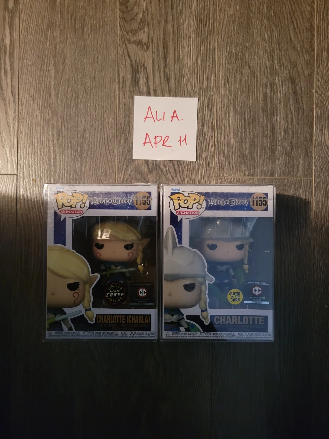 Two Funko Pop! figures from Black Clover. Includes Charlotte (Charla) with a limited glow chase edition and another Charlotte figure that glows in the dark. Both figures are vinyl and come in their original boxes.