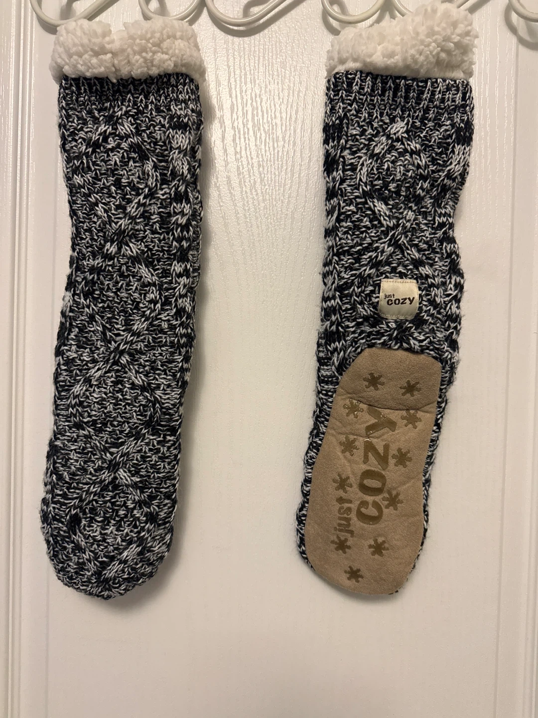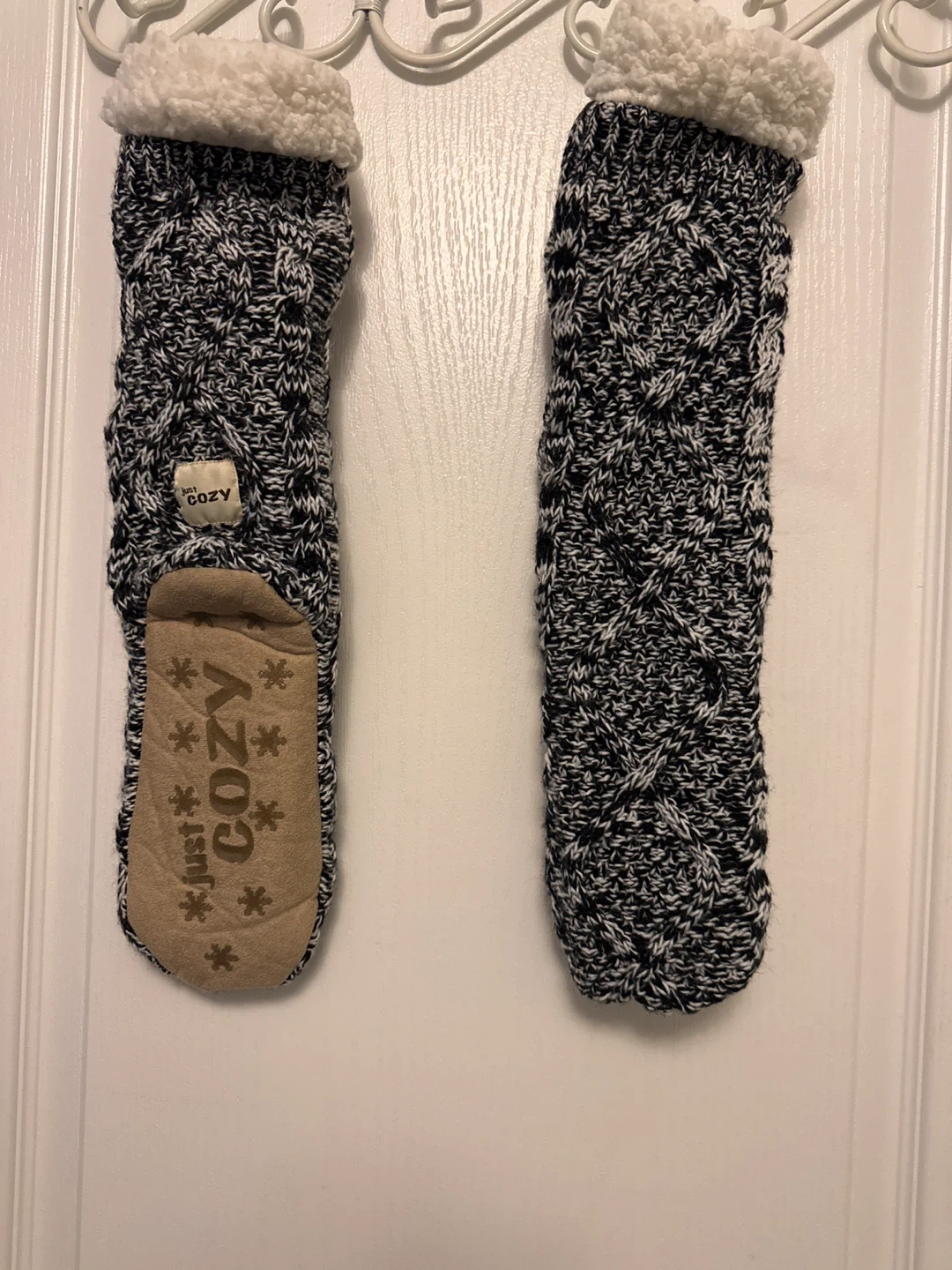 Never used comfy slipper socks from Just Cozy. They have a soft sherpa lining and grippy soles for traction. Received as a gift but never worn. Forgot the size but around size 7 women’s