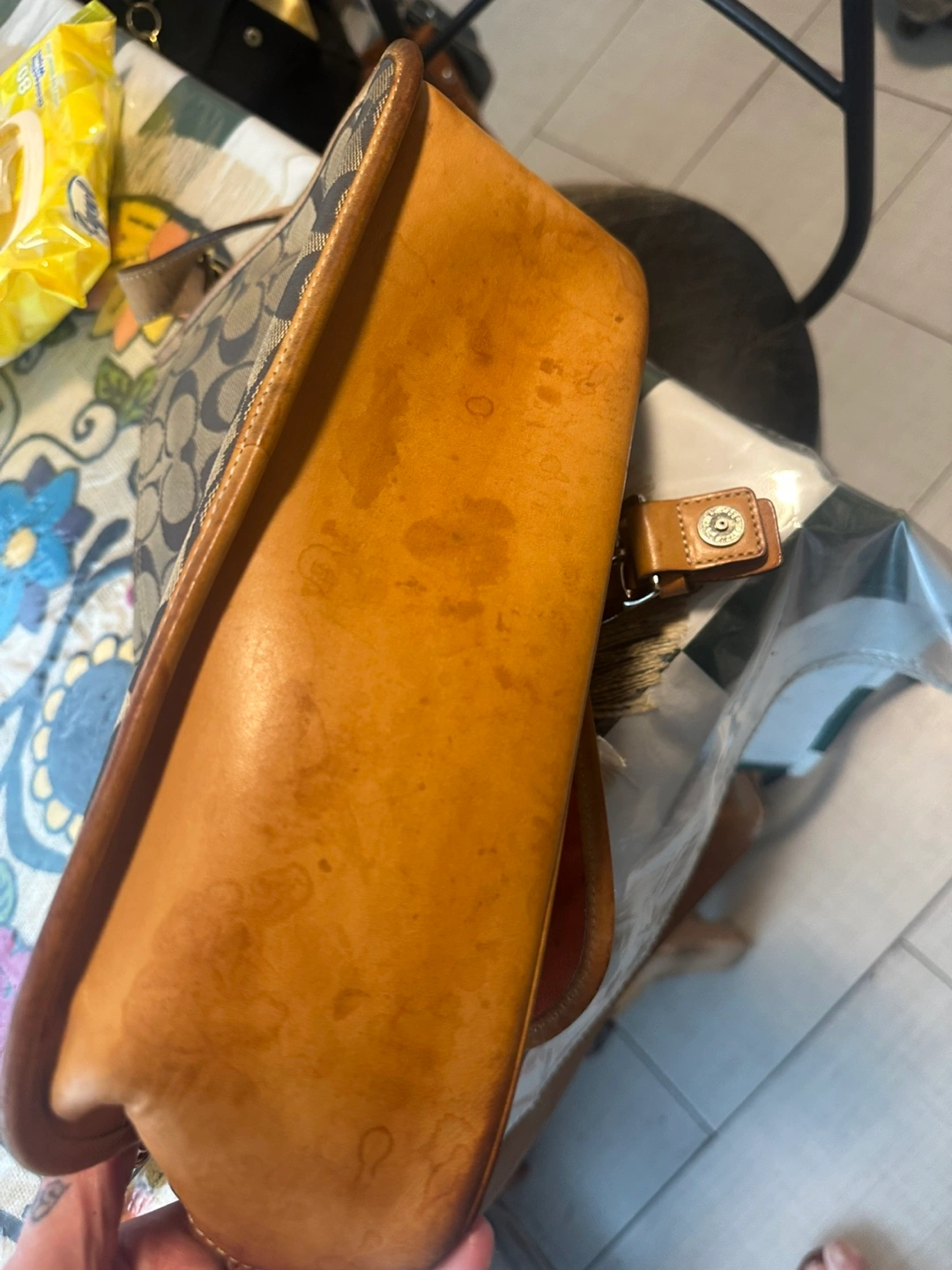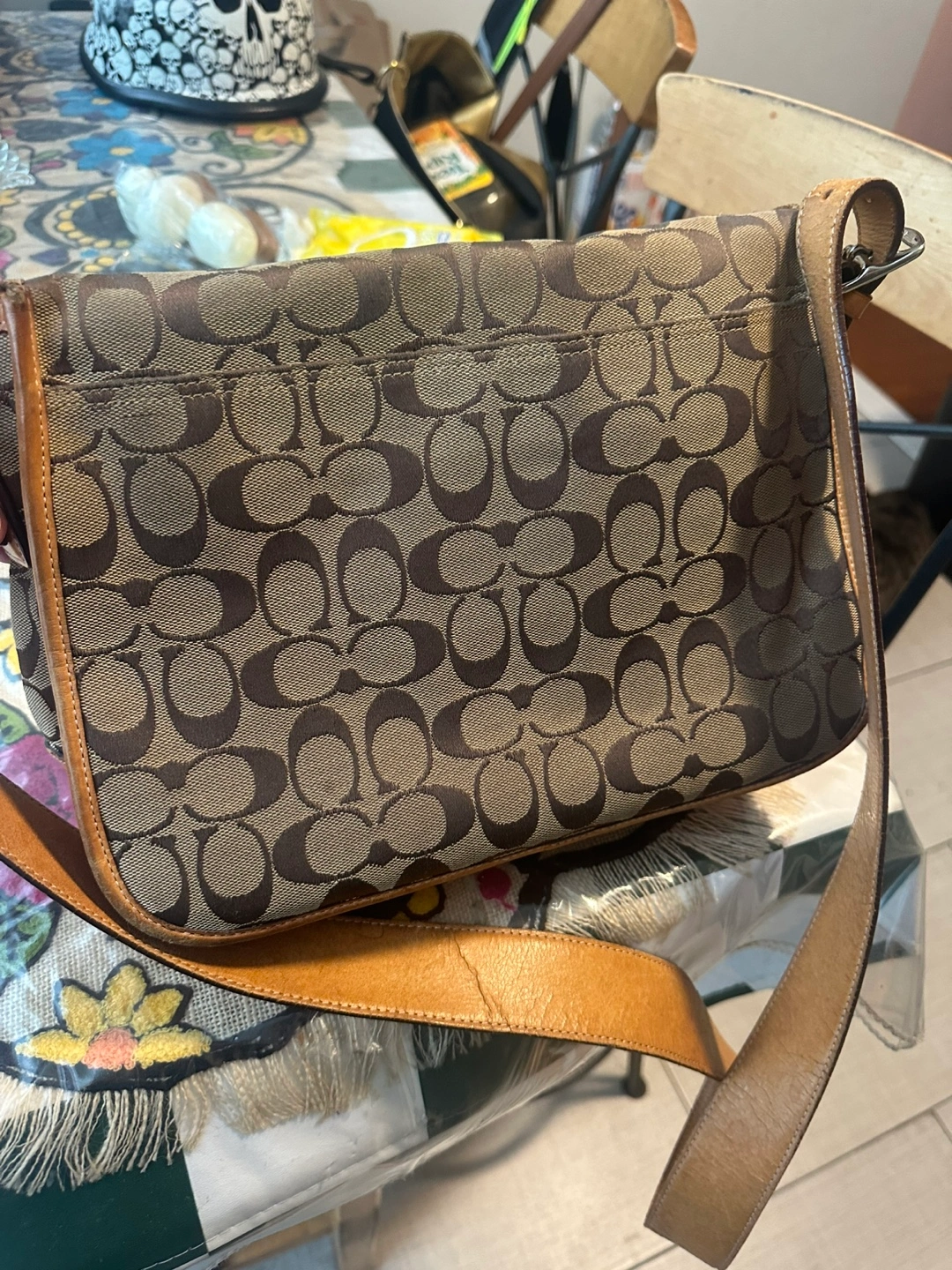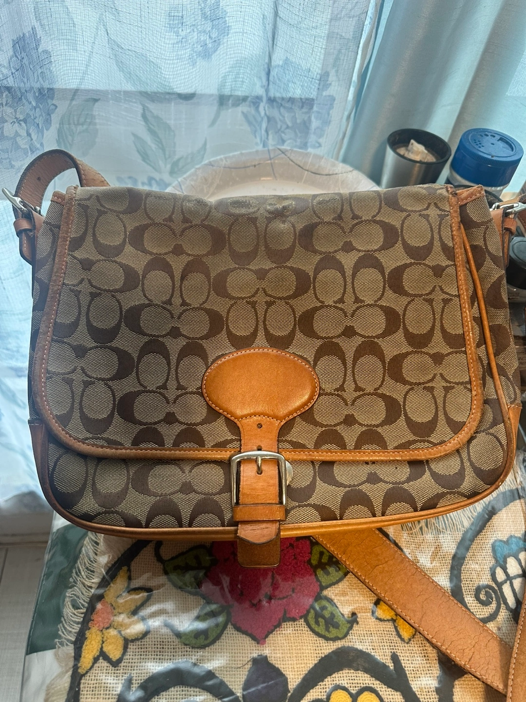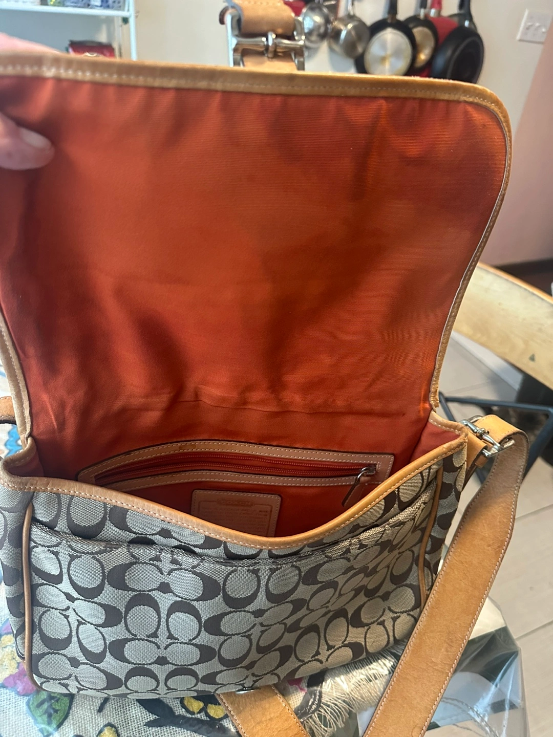 Pre-owned Coach crossbody bag. Beige signature canvas with tan leather trim. Adjustable shoulder strap. Interior zip pocket and slip pocket. Shows signs of wear.