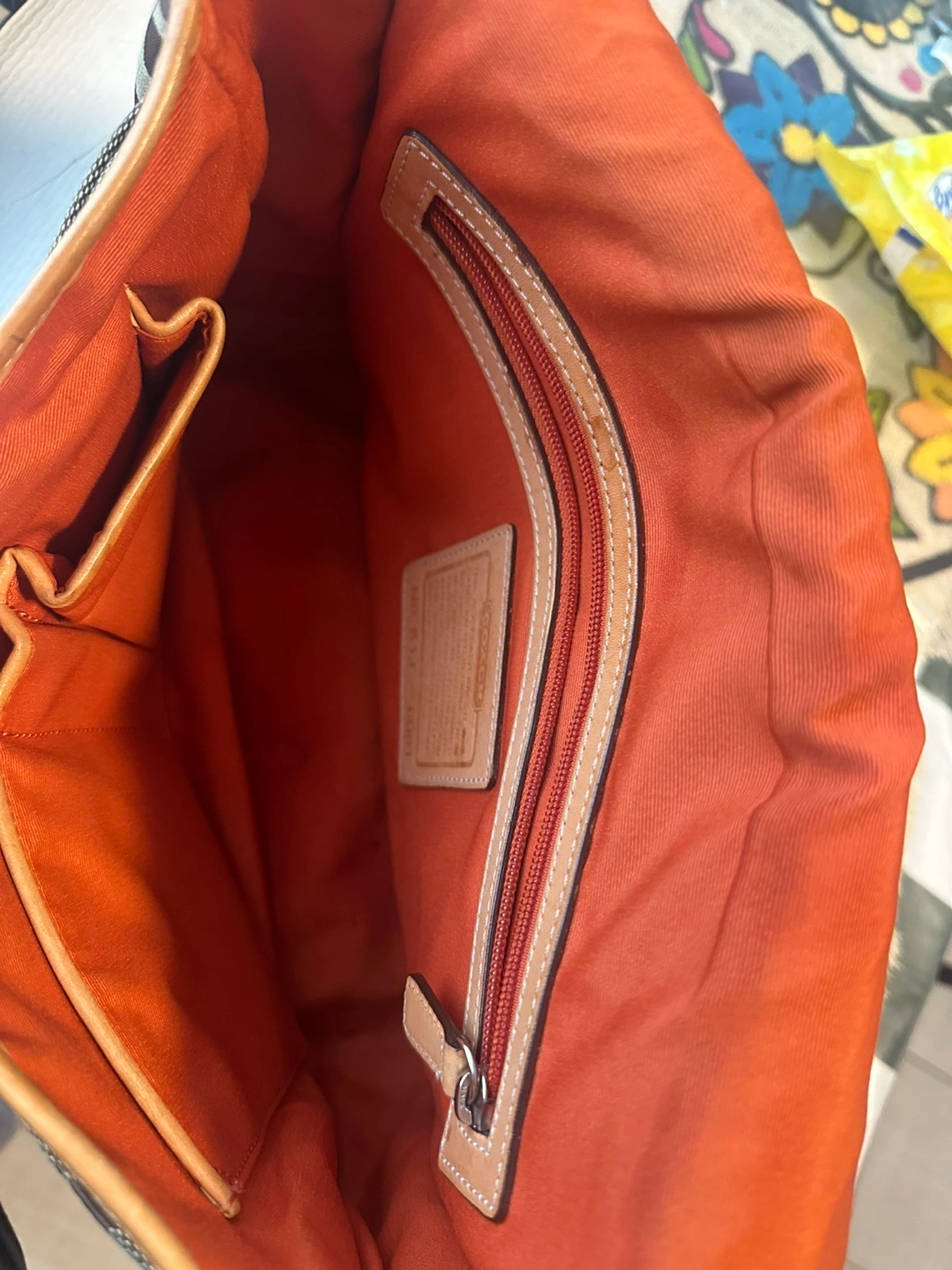 Pre-owned Coach crossbody bag. Beige signature canvas with tan leather trim. Adjustable shoulder strap. Interior zip pocket and slip pocket. Shows signs of wear.