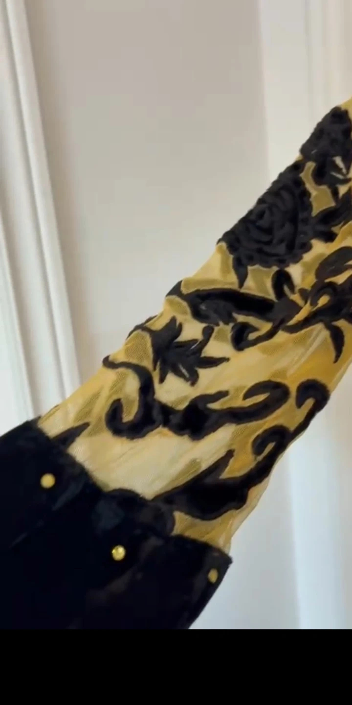 A stunning 1-piece Indian Anarkali gown in black and gold, designed and handcrafted in my own boutique in Delhi. The gown features delicate sequins all over, velvet borders adorned with sparkling stones, and intricate cutwork on the neck, sleeves, and back, creating a luxurious and elegant look.