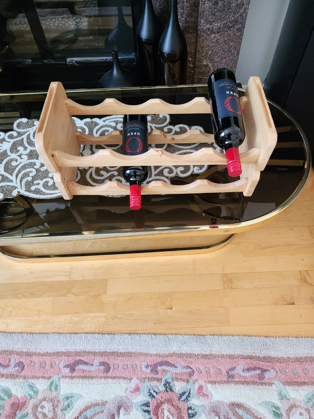 This is a simple wooden wine rack. It's made of light-coloured wood and can hold multiple bottles. It's a handy piece for storing your wine collection.Stackable, can hold 8 bottles, 2 pieces.