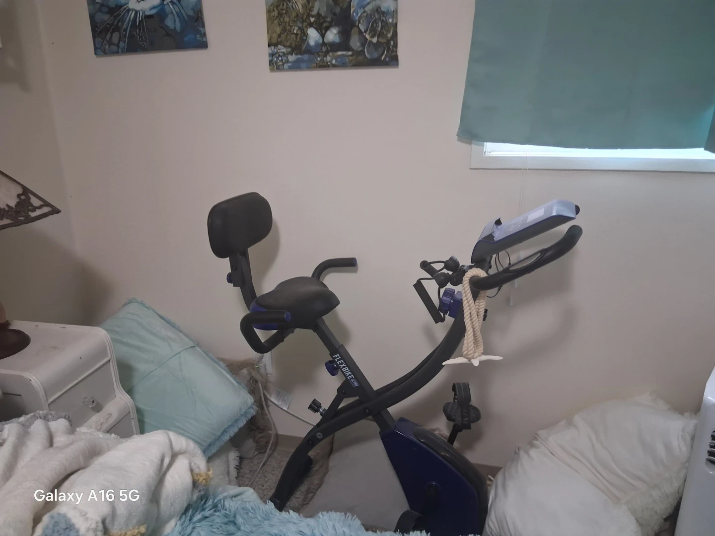 This is a FlexBike stationary exercise bike. It has an adjustable seat and handlebars for comfort. A display screen shows workout metrics.