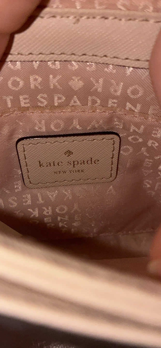 A light beige Kate Spade New York crossbody bag. Leather material with an adjustable strap. Comes with interior branding.