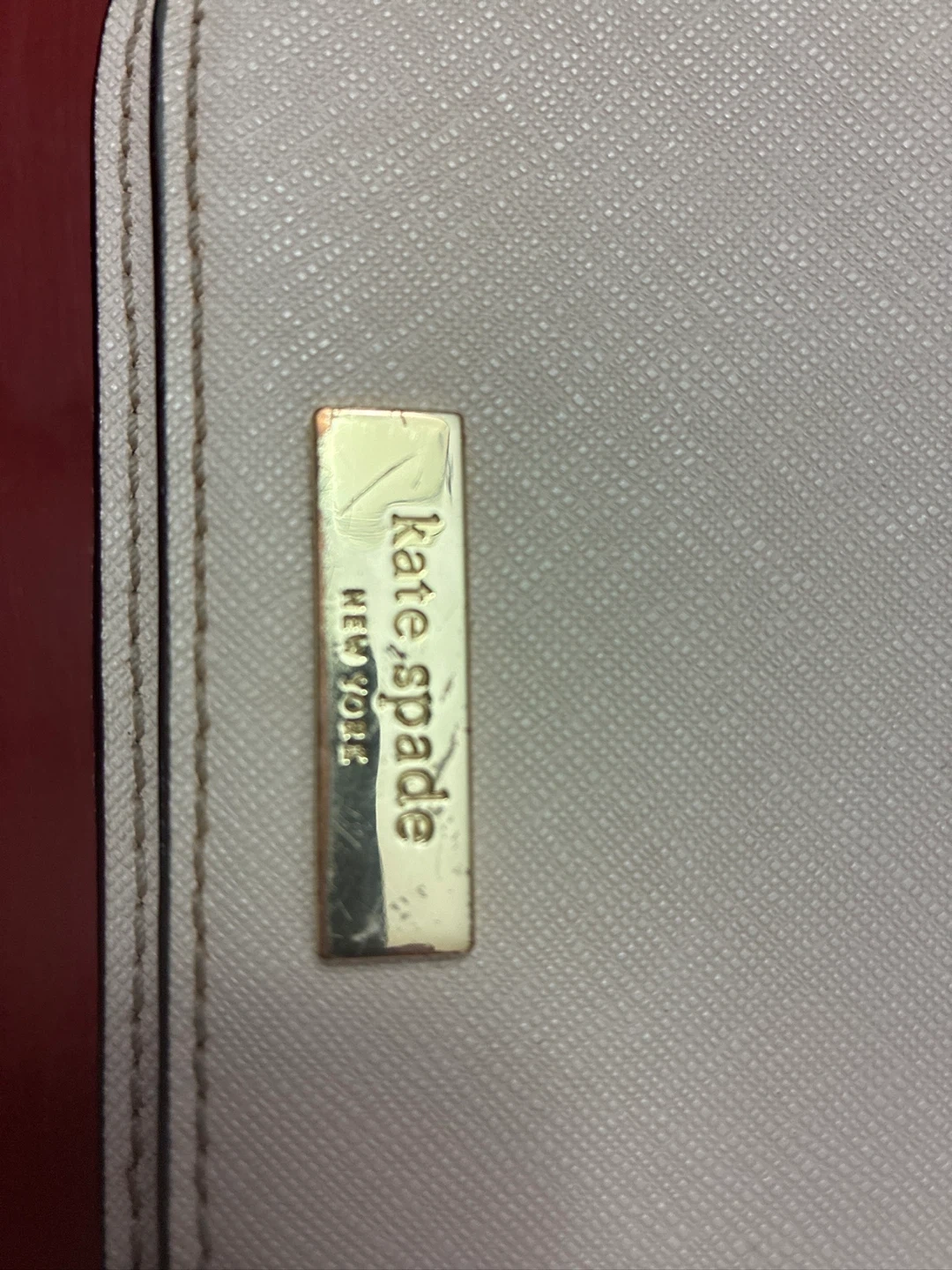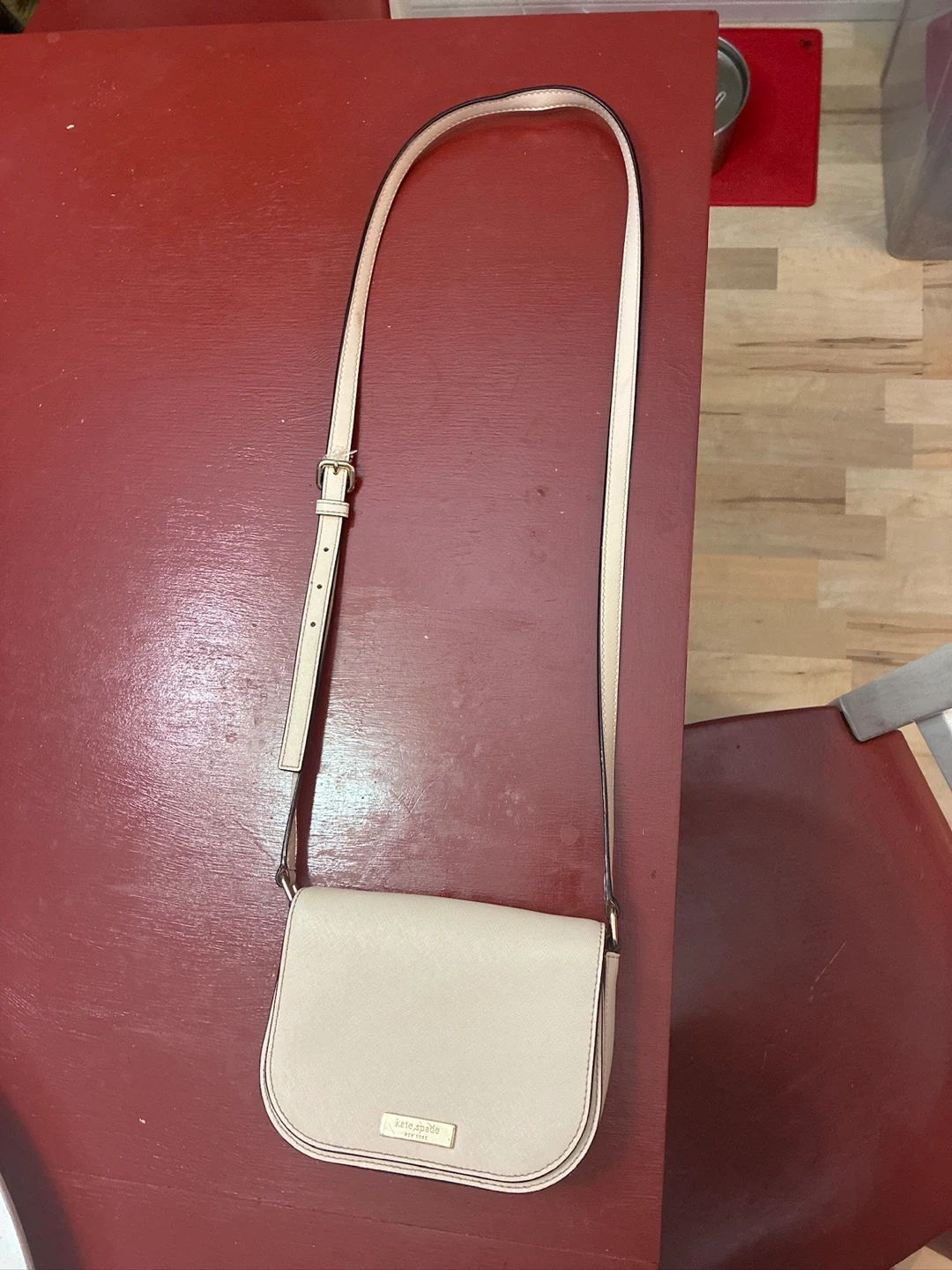 A light beige Kate Spade New York crossbody bag. Leather material with an adjustable strap. Comes with interior branding.
