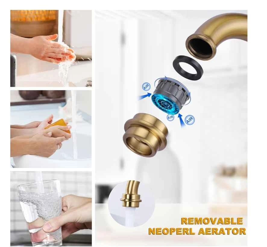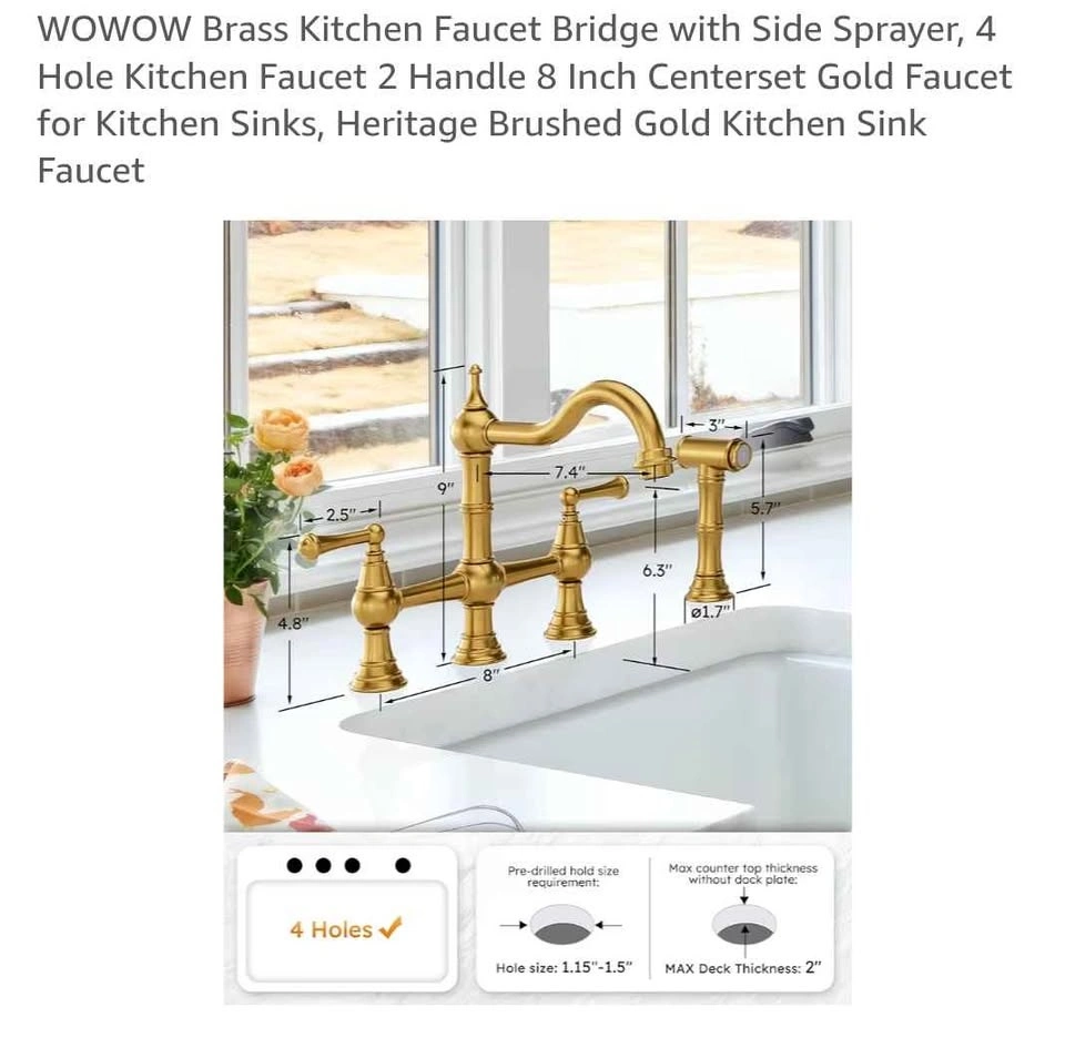 Stylish WOWOW brass kitchen faucet with a beautiful brushed gold finish. Features a bridge design with two handles and a side sprayer that pulls out up to 18 inches. The sprayer has high-pressure water, great for dishes, with an easy on/off button. Designed for 4-hole sinks with 8-inch centerset. Hole size 1.15"-1.5", max deck thickness 2".