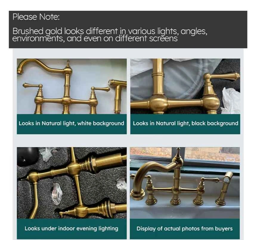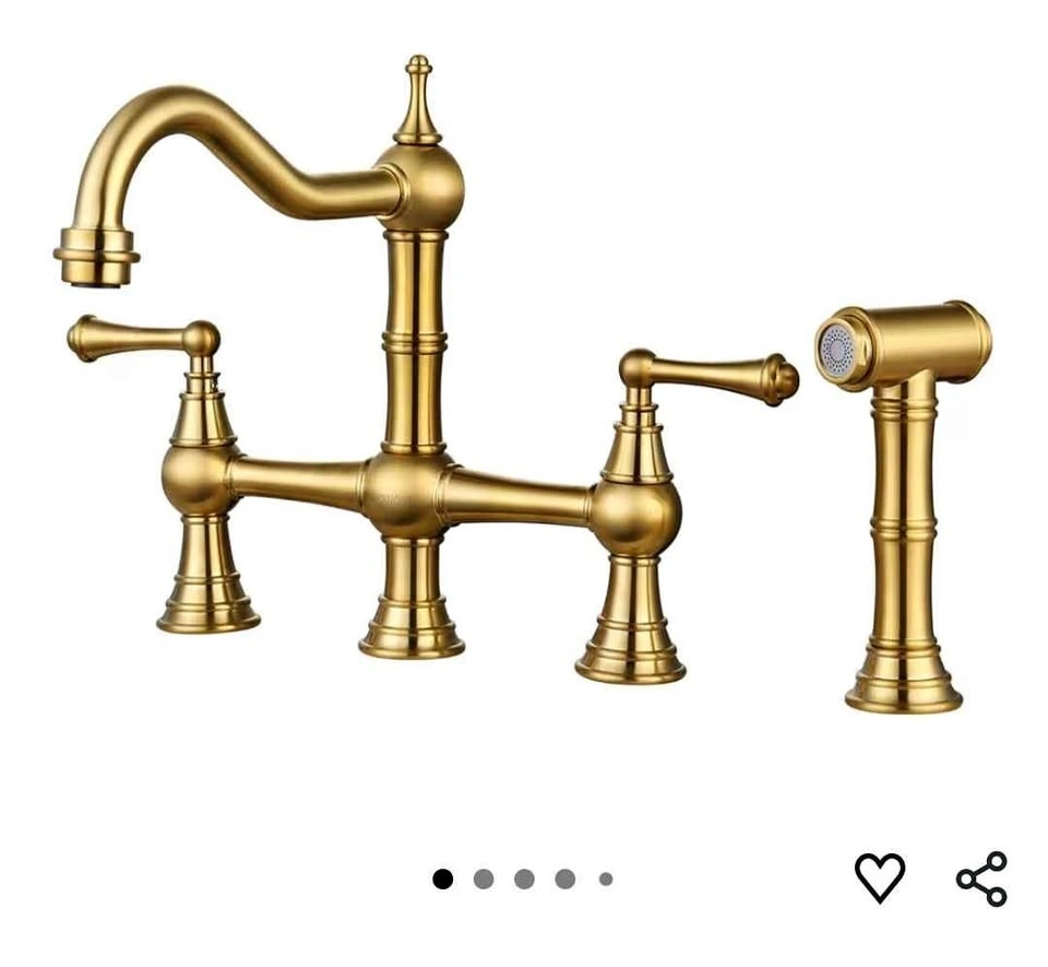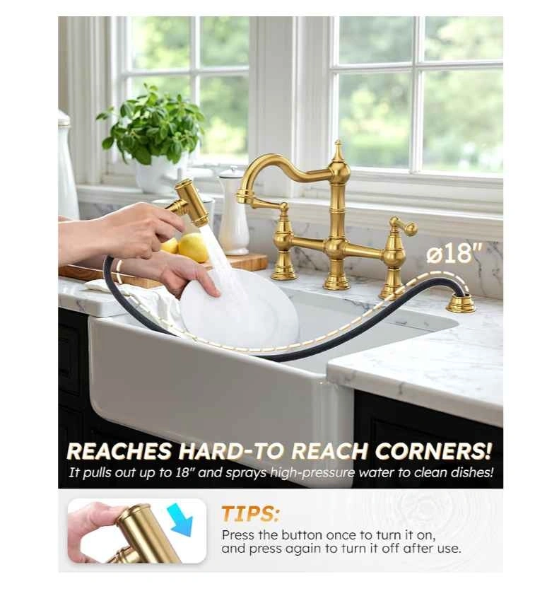 Stylish WOWOW brass kitchen faucet with a beautiful brushed gold finish. Features a bridge design with two handles and a side sprayer that pulls out up to 18 inches. The sprayer has high-pressure water, great for dishes, with an easy on/off button. Designed for 4-hole sinks with 8-inch centerset. Hole size 1.15"-1.5", max deck thickness 2".