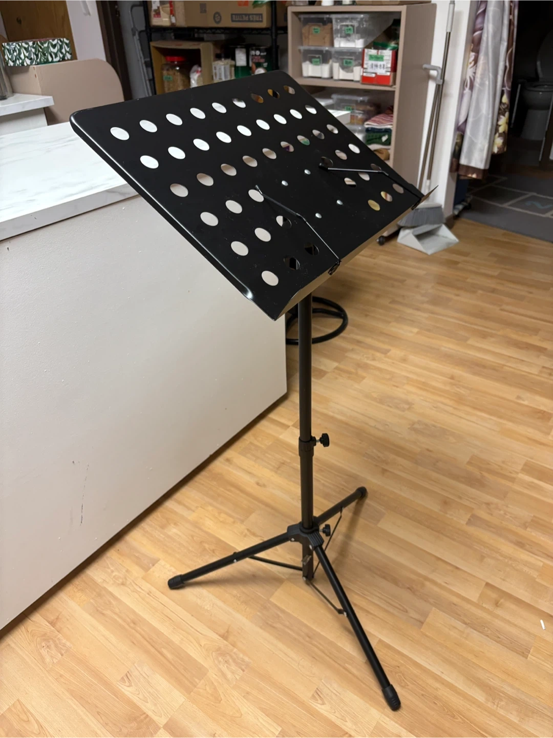 This is a black, adjustable music stand. It's made of metal with a tripod base for stability. The height and angle are adjustable to suit your needs.