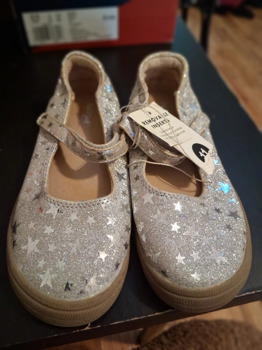 Sparkly silver Mary Jane shoes with star patterns. Features a hook-and-loop closure for easy on and off. Removable insoles provide a snugger fit for growing feet! Perfect for dressing up any outfit.