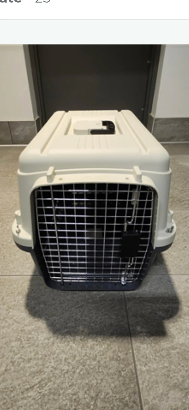 White and dark grey pet carrier crate. It features a metal wire door for ventilation and security. This carrier is suitable for small to medium pets.