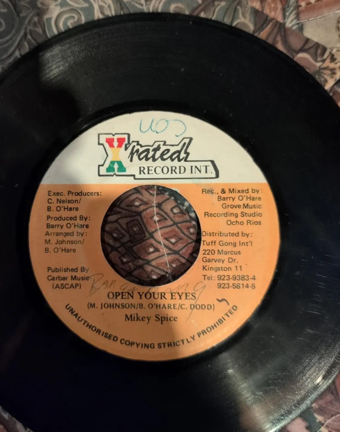 This is a 7-inch vinyl record of "Open Your Eyes" by Mikey Spice. It was produced by Barry O'Hare and published by Carbar Music. The record is from X-Rated Record Int. and distributed by Tuff Gong Int'l.