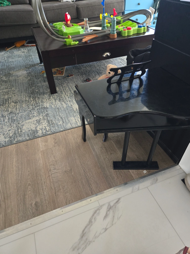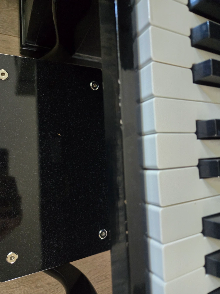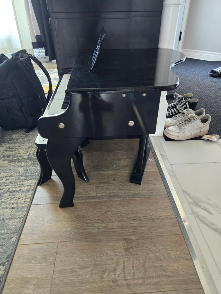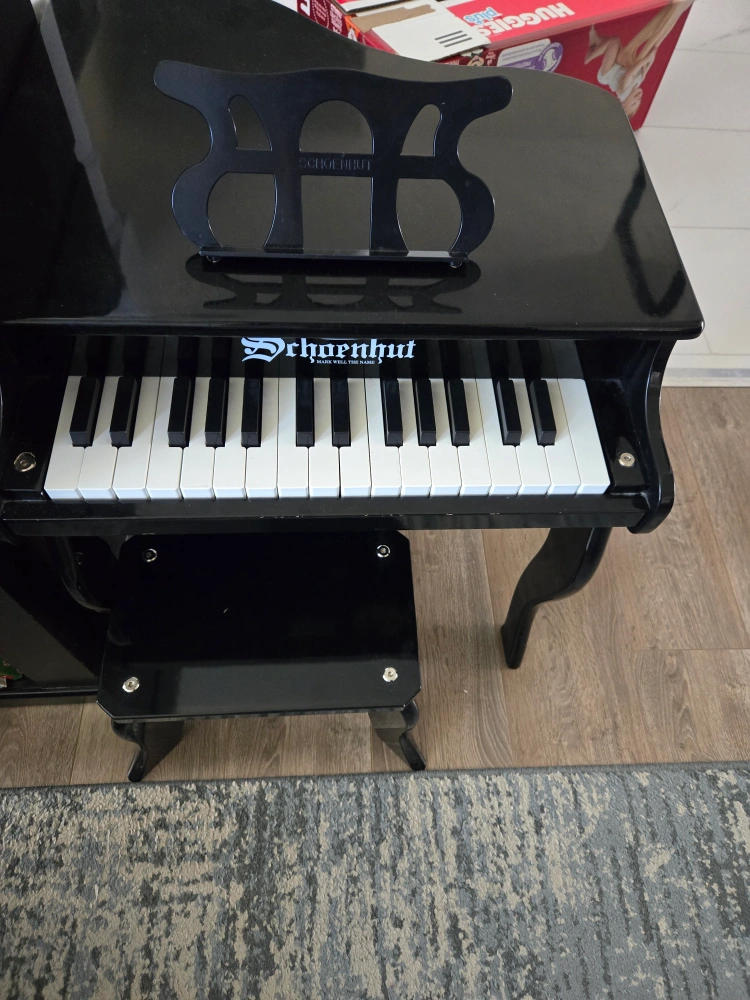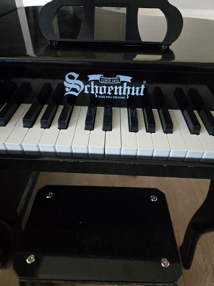 A black Schoenhut toy piano with a music stand and a small stool. The piano plays a sound when keys are pressed. Hardly used. A few scratches from moving (in the pictures)