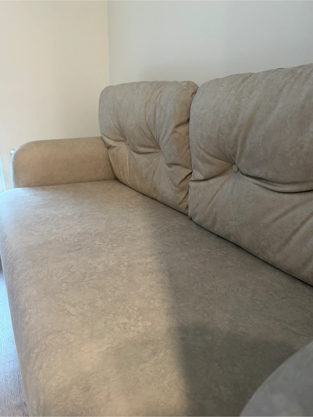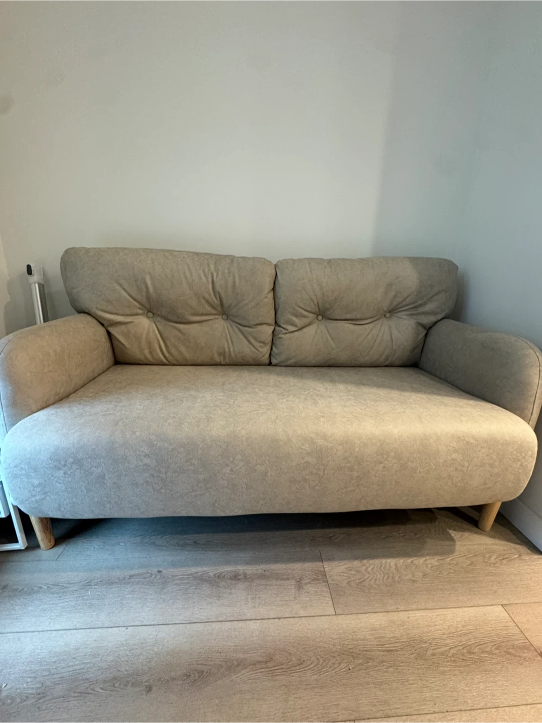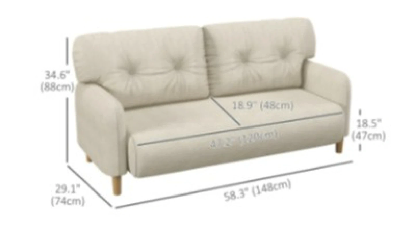 This is a beige loveseat sofa with button tufting. It's made of fabric and has wooden legs.