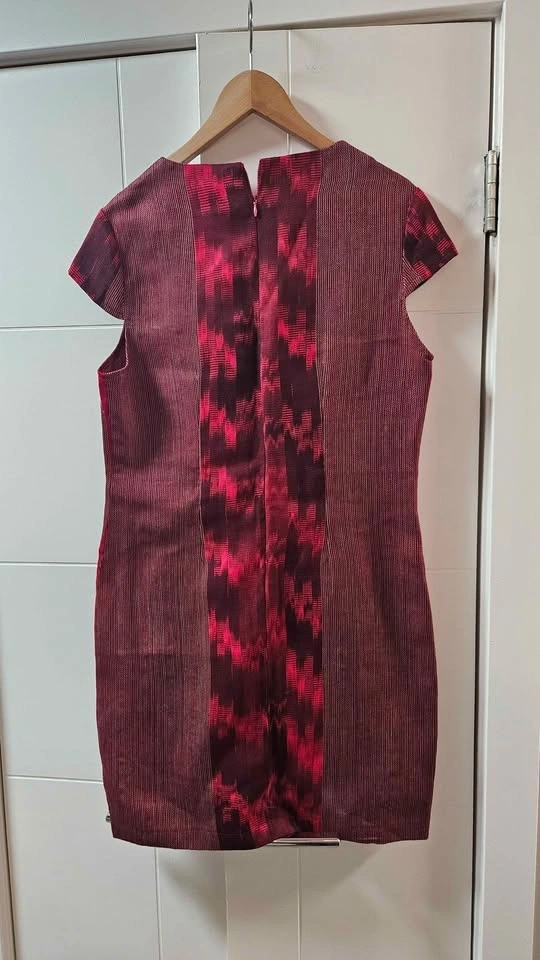Stylish dress with a cool red and maroon patterned design. Short sleeves. Has two front pockets. Zipper closure in back. Pick up near Yonge and St Clair.