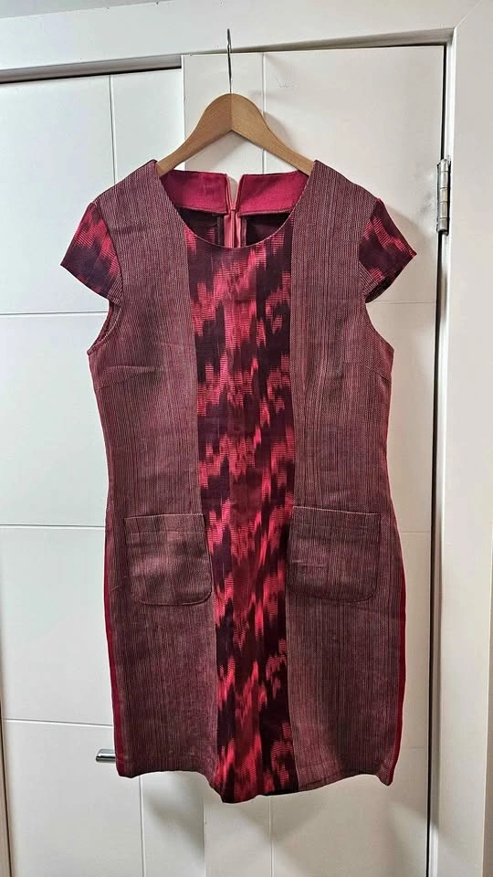 Stylish dress with a cool red and maroon patterned design. Short sleeves. Has two front pockets. Zipper closure in back. Pick up near Yonge and St Clair.