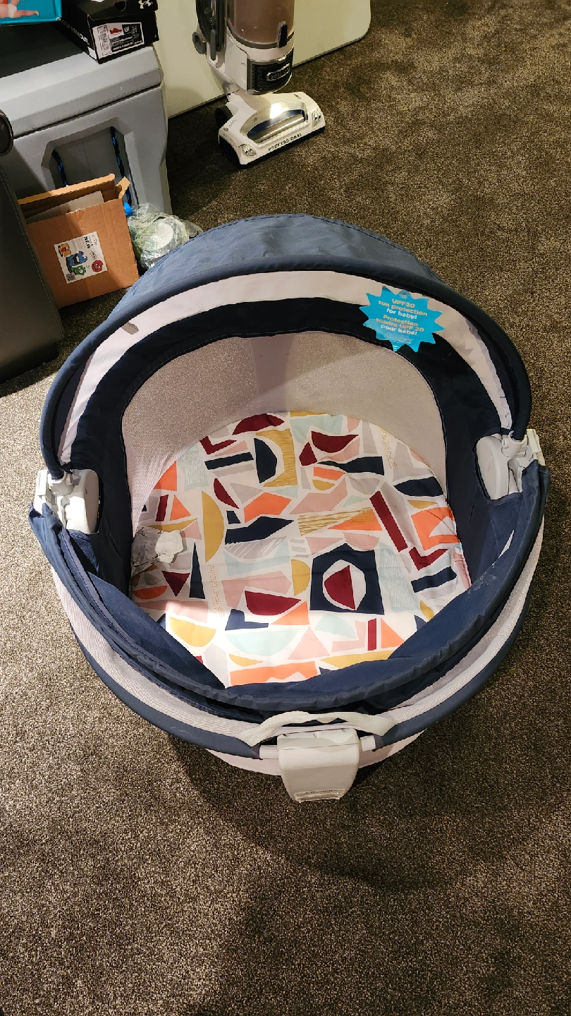 Selling a Infant portable playard! It features UPF20 sun protection for baby and a colourful patterned interior. Great for indoor or outdoor use to keep your little one safe and comfy
