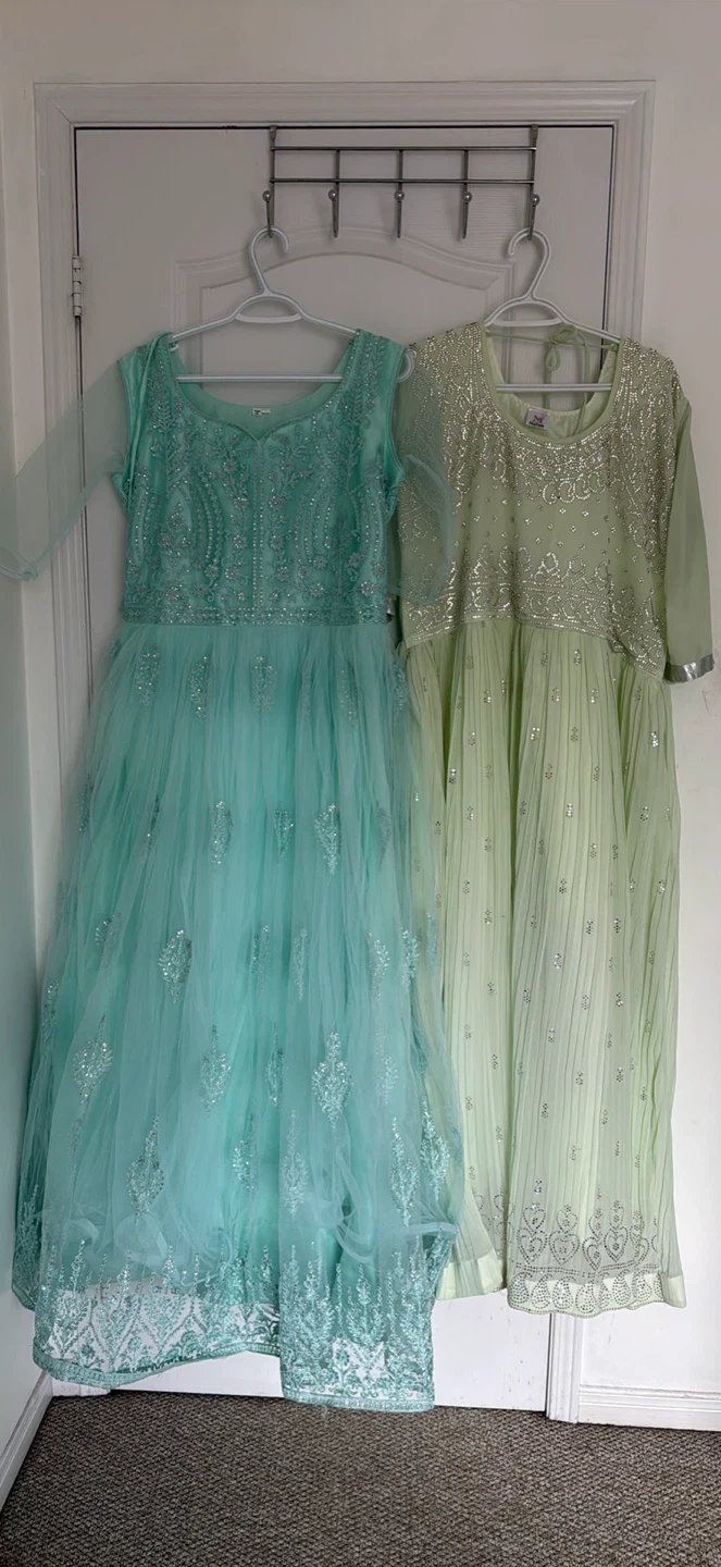 2 Beautiful gorgeous gowns. One aqua color, other light green. Both have shiny silver embroidery and sequin work. Aqua dress has flowy net skirt. Green dress has pleated skirt.